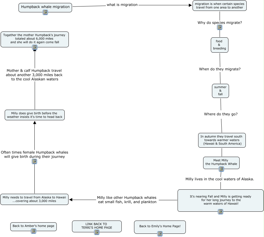This Concept Map, created with IHMC CmapTools, has information related to: Untitled 3, Milly needs to travel from Alaska to Hawaii ...covering about 3,000 miles Often times female Humpback whales will give birth during their journey Milly does give birth before the weather insists it's time to head back, It's nearing Fall and Milly is getting ready for her long journey to the warm waters of Hawaii! Milly like other Humpback whales eat small fish, krill, and plankton Milly needs to travel from Alaska to Hawaii ...covering about 3,000 miles, migration is when certain species travel from one area to another Why do species migrate? food & breeding, Humpback whale migration what is migration migration is when certain species travel from one area to another, food & breeding When do they migrate? summer & fall, Milly does give birth before the weather insists it's time to head back Mother & calf Humpback travel about another 3,000 miles back to the cool Alaskan waters Together the mother Humpback's journey totaled about 6,000 miles and she will do it again come fall, summer & fall Where do they go? In autumn they travel south towards warmer waters (Hawaii & South America), Meet Milly the Humpback Whale Milly lives in the cool waters of Alaska. It's nearing Fall and Milly is getting ready for her long journey to the warm waters of Hawaii!, In autumn they travel south towards warmer waters (Hawaii & South America) Meet Milly the Humpback Whale