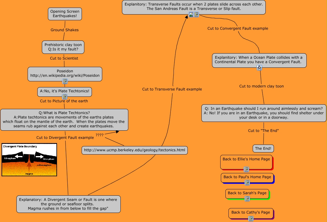 This Concept Map, created with IHMC CmapTools, has information related to: Earthquake.cmap, Q:What is Plate Techtonics? A:Plate techtonics are movements of the earths plates which float on the mantle of the earth. When the plates move the seams rub against each other and create earthquakes. Cut to Divergent Fault example Explanatory: A Divergent Seam or Fault is one where the ground or seafloor splits. Magma rushes in from below to fill the gap", http://www.ucmp.berkeley.edu/geology/tectonics.html ???? Q:What is Plate Techtonics? A:Plate techtonics are movements of the earths plates which float on the mantle of the earth. When the plates move the seams rub against each other and create earthquakes., Opening Screen Earthquakes! Ground Shakes Prehistoric clay toon Q:Is it my fault?, A:No, it's Plate Techtonics! Cut to Picture of the earth Q:What is Plate Techtonics? A:Plate techtonics are movements of the earths plates which float on the mantle of the earth. When the plates move the seams rub against each other and create earthquakes., Q: In an Earthquake should I run around aimlessly and scream? A: No! If you are in an Earthquake, you should find shelter under your desk or in a doorway. Cut to "The End" The End!, Explanitory: Transverse Faults occur when 2 plates slide across each other. The San Andreas Fault is a Transverse or Slip fault. Cut to Convergent Fault example Explanitory: When a Ocean Plate collides with a Continental Plate you have a Convergent Fault., Explanatory: A Divergent Seam or Fault is one where the ground or seafloor splits. Magma rushes in from below to fill the gap" Cut to Transverse Fault example Explanitory: Transverse Faults occur when 2 plates slide across each other. The San Andreas Fault is a Transverse or Slip fault., Prehistoric clay toon Q:Is it my fault? Cut to Scientist A:No, it's Plate Techtonics!, Explanitory: When a Ocean Plate collides with a Continental Plate you have a Convergent Fault. Cut to modern clay toon Q: In an Earthquake should I run around aimlessly and scream? A: No! If you are in an Earthquake, you should find shelter under your desk or in a doorway.