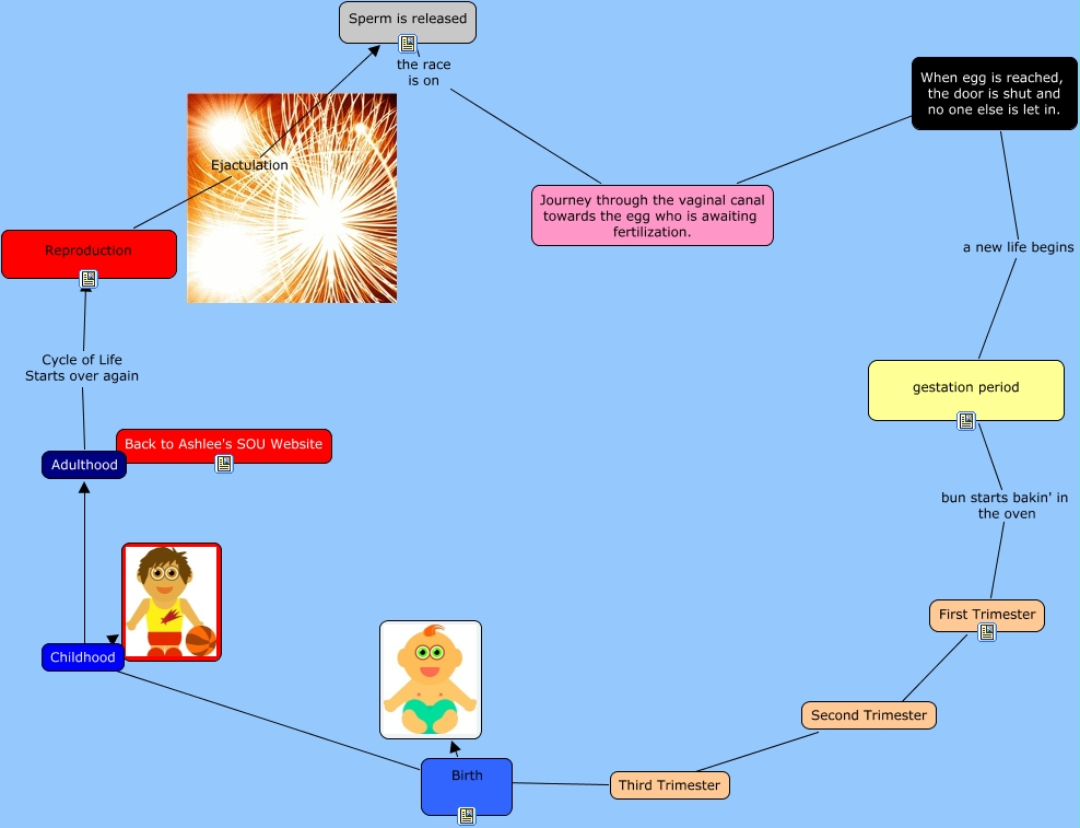 This Concept Map, created with IHMC CmapTools, has information related to: Reproduction, Second Trimester ???? Third Trimester, gestation period bun starts bakin' in the oven First Trimester, Birth ???? Adulthood, Birth ???? Childhood, Journey through the vaginal canal towards the egg who is awaiting fertilization. ???? When egg is reached, the door is shut and no one else is let in., When egg is reached, the door is shut and no one else is let in. a new life begins gestation period, First Trimester ???? Second Trimester, Sperm is released the race is on Journey through the vaginal canal towards the egg who is awaiting fertilization., Reproduction Ejactulation Sperm is released, Childhood, Third Trimester ???? Birth, Birth, Adulthood Cycle of Life Starts over again Reproduction