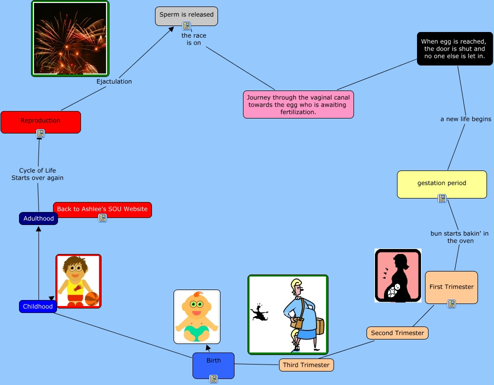 This Concept Map, created with IHMC CmapTools, has information related to: CMAP_final, Journey through the vaginal canal towards the egg who is awaiting fertilization. ???? When egg is reached, the door is shut and no one else is let in., Birth ???? Childhood, Birth ???? Adulthood, gestation period bun starts bakin' in the oven First Trimester, Second Trimester ???? Third Trimester, When egg is reached, the door is shut and no one else is let in. a new life begins gestation period, Reproduction Ejactulation Sperm is released, Sperm is released the race is on Journey through the vaginal canal towards the egg who is awaiting fertilization., First Trimester ???? Second Trimester, Birth, Third Trimester ???? Birth, Childhood, Adulthood Cycle of Life Starts over again Reproduction