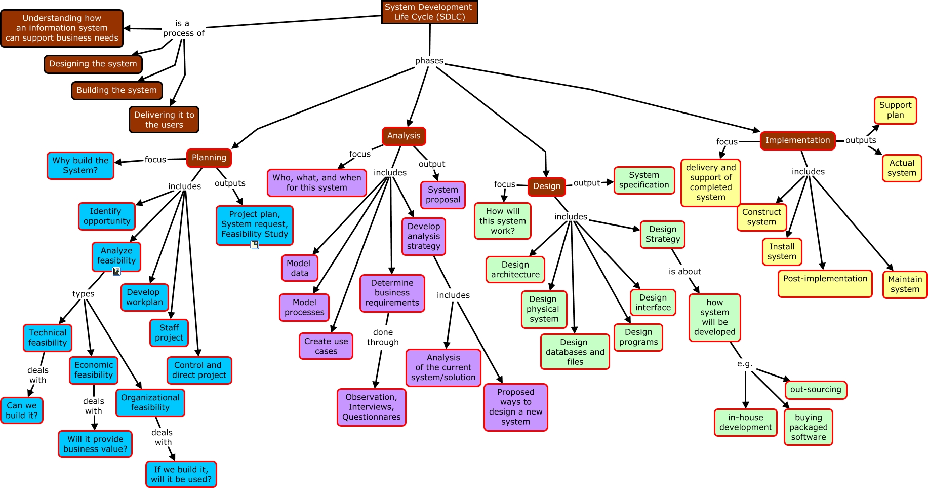 This Concept Map, created with IHMC CmapTools, has information related to: System Development Life Cycle Phases, System Development Life Cycle (SDLC) phases Analysis, how system will be developed e.g. in-house development, how system will be developed e.g. buying packaged software, Planning focus Why build the System?, Technical feasibility deals with Can we build it?, System Development Life Cycle (SDLC) is a process of Understanding how an information system can support business needs, System Development Life Cycle (SDLC) phases Implementation, Analyze feasibility types Economic feasibility, System Development Life Cycle (SDLC) phases Planning, Analysis includes Create use cases, Planning includes Identify opportunity, Analysis includes Determine business requirements, Design Strategy is about how system will be developed, Planning includes Control and direct project, Planning includes Develop workplan, Analysis focus Who, what, and when for this system, Determine business requirements done through Observation, Interviews, Questionnares, Develop analysis strategy includes Analysis of the current system/solution, System Development Life Cycle (SDLC) is a process of Building the system, Analysis includes Model processes