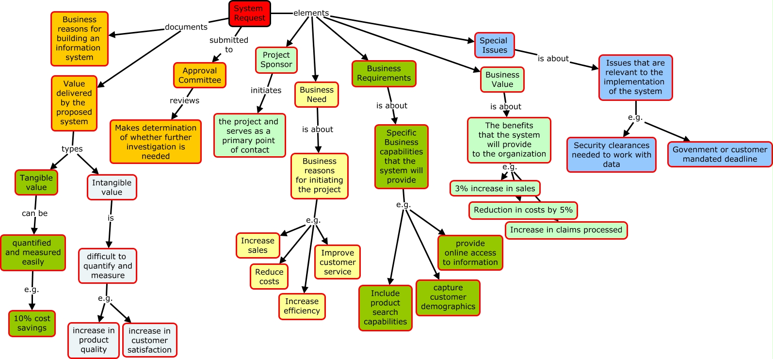 This Concept Map, created with IHMC CmapTools, has information related to: System Request, Value delivered by the proposed system types Intangible value, Intangible value is difficult to quantify and measure, Business Need is about Business reasons for initiating the project, quantified and measured easily e.g. 10% cost savings, System Request elements Project Sponsor, Approval Committee reviews Makes determination of whether further investigation is needed, The benefits that the system will provide to the organization e.g. Increase in claims processed, System Request elements Business Requirements, difficult to quantify and measure e.g. increase in product quality, Special Issues is about Issues that are relevant to the implementation of the system, System Request documents Business reasons for building an information system, Issues that are relevant to the implementation of the system e.g. Security clearances needed to work with data, System Request elements Business Need, The benefits that the system will provide to the organization e.g. 3% increase in sales, Business Requirements is about Specific Business capabilities that the system will provide, Business reasons for initiating the project e.g. Increase sales, Business reasons for initiating the project e.g. Reduce costs, System Request submitted to Approval Committee, Business Value is about The benefits that the system will provide to the organization, Project Sponsor initiates the project and serves as a primary point of contact