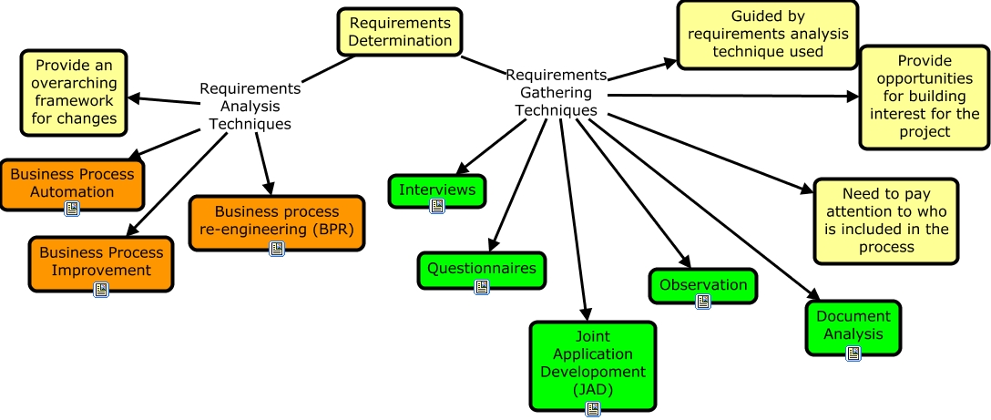 This Concept Map, created with IHMC CmapTools, has information related to: Techniques for requirements determination, Requirements Determination Requirements Gathering Techniques Interviews, Requirements Determination Requirements Analysis Techniques Business Process Improvement, Requirements Determination Requirements Gathering Techniques Joint Application Developoment (JAD), Requirements Determination Requirements Gathering Techniques Observation, Requirements Determination Requirements Analysis Techniques Provide an overarching framework for changes, Requirements Determination Requirements Gathering Techniques Guided by requirements analysis technique used, Requirements Determination Requirements Gathering Techniques Document Analysis, Requirements Determination Requirements Gathering Techniques Provide opportunities for building interest for the project, Requirements Determination Requirements Gathering Techniques Questionnaires, Requirements Determination Requirements Analysis Techniques Business process re-engineering (BPR), Requirements Determination Requirements Analysis Techniques Business Process Automation, Requirements Determination Requirements Gathering Techniques Need to pay attention to who is included in the process