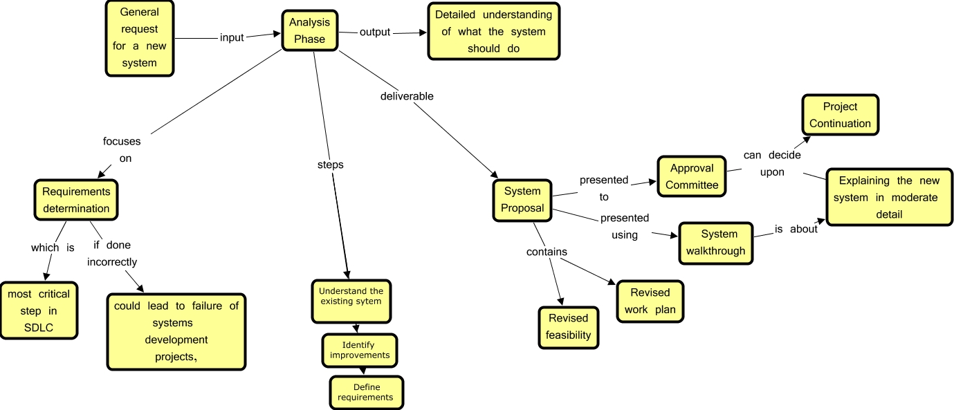 This Concept Map, created with IHMC CmapTools, has information related to: Overview of Analysis Phase, System Proposal contains Revised feasibility, Explaining the new system in moderate detail can decide upon Project Continuation, Analysis Phase output Detailed understanding of what the system should do, System Proposal presented using System walkthrough, Analysis Phase steps Identify improvements, Approval Committee can decide upon Project Continuation, Analysis Phase steps Understand the existing sytem, General request for a new system input Analysis Phase, System Proposal presented to Approval Committee, Requirements determination which is most critical step in SDLC, Requirements determination if done incorrectly could lead to failure of systems development projects,, Analysis Phase deliverable System Proposal, Analysis Phase steps Define requirements, Analysis Phase focuses on Requirements determination, System Proposal contains Revised work plan, System walkthrough is about Explaining the new system in moderate detail