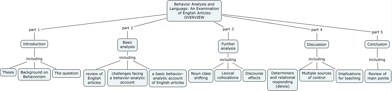 This Concept Map, created with IHMC CmapTools, has information related to: BAofArticles-Overview, Behavior Analysis and Language: An Examination of English Articles OVERVIEW part 2 Basic analysis, Further analysis including Lexical collocations, Behavior Analysis and Language: An Examination of English Articles OVERVIEW part 1 Introduction, Behavior Analysis and Language: An Examination of English Articles OVERVIEW part 4 Discussion, Conclusion including Review of main points, Behavior Analysis and Language: An Examination of English Articles OVERVIEW part 3 Further analysis, Further analysis including Noun class shifting, Basic analysis including challenges facing a behavior-analytic account, Discussion including Determiners and relational responding (deixis), Discussion including Multiple sources of control, Introduction including The question, Behavior Analysis and Language: An Examination of English Articles OVERVIEW part 5 Conclusion, Introduction including Thesis, Discussion including Implications for teaching, Introduction including Background on Behaviorism, Basic analysis including a basic behavior- analytic account of English articles, Further analysis including Discourse effects, Basic analysis including review of English articles