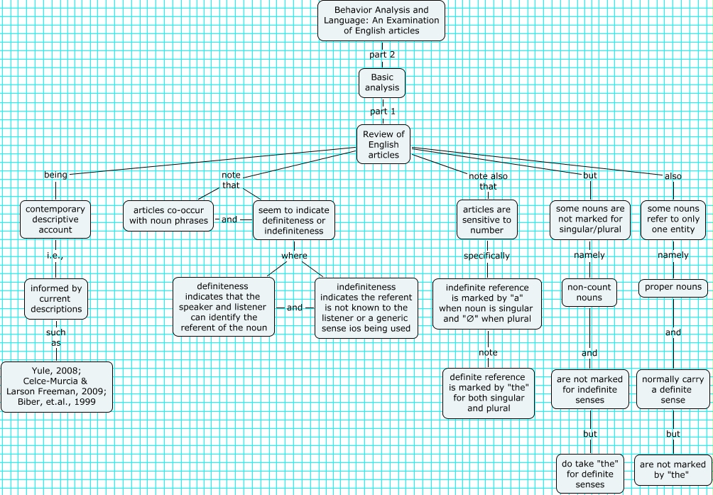 This Concept Map, created with IHMC CmapTools, has information related to: BAofArticles-EngArtReview-1, proper nouns and normally carry a definite sense, seem to indicate definiteness or indefiniteness where indefiniteness indicates the referent is not known to the listener or a generic sense ios being used, articles co-occur with noun phrases and seem to indicate definiteness or indefiniteness, are not marked for indefinite senses but do take "the" for definite senses, some nouns are not marked for singular/plural namely non-count nouns, normally carry a definite sense but are not marked by "the", Review of English articles note that seem to indicate definiteness or indefiniteness, Review of English articles note also that articles are sensitive to number, non-count nouns and are not marked for indefinite senses, indefinite reference is marked by "a" when noun is singular and "∅" when plural note definite reference is marked by "the" for both singular and plural, informed by current descriptions such as Yule, 2008; Celce-Murcia & Larson Freeman, 2009; Biber, et.al., 1999, some nouns refer to only one entity namely proper nouns, Basic analysis part 1 Review of English articles, Behavior Analysis and Language: An Examination of English articles part 2 Basic analysis, seem to indicate definiteness or indefiniteness where definiteness indicates that the speaker and listener can identify the referent of the noun, Review of English articles but some nouns are not marked for singular/plural, Review of English articles being contemporary descriptive account, Review of English articles note that articles co-occur with noun phrases, articles are sensitive to number specifically indefinite reference is marked by "a" when noun is singular and "∅" when plural, definiteness indicates that the speaker and listener can identify the referent of the noun and indefiniteness indicates the referent is not known to the listener or a generic sense ios being used