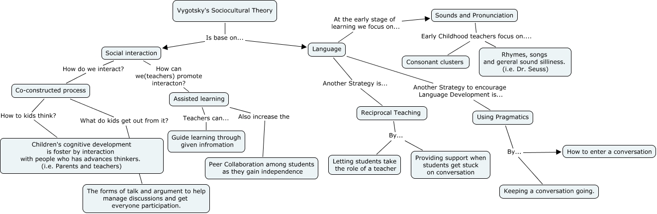 This Concept Map, created with IHMC CmapTools, has information related to: vygotsky, Co-constructed process How to kids think? Children's cognitive development is foster by interaction with people who has advances thinkers. (i.e. Parents and teachers), Reciprocal Teaching By... Letting students take the role of a teacher, Language Another Strategy to encourage Language Development is... Using Pragmatics, Sounds and Pronunciation Early Childhood teachers focus on.... Rhymes, songs and gereral sound silliness. (i.e. Dr. Seuss), Social interaction How can we(teachers) promote interacton? Assisted learning, Social interaction How do we interact? Co-constructed process, Co-constructed process What do kids get out from it? The forms of talk and argument to help manage discussions and get everyone participation., Reciprocal Teaching By... Providing support when students get stuck on conversation, Using Pragmatics By... How to enter a conversation, Sounds and Pronunciation Early Childhood teachers focus on.... Consonant clusters, Assisted learning Teachers can... Guide learning through given infromation, Assisted learning Also increase the Peer Collaboration among students as they gain independence, Using Pragmatics By... Keeping a conversation going., Language Another Strategy is... Reciprocal Teaching, Language At the early stage of learning we focus on... Sounds and Pronunciation, Vygotsky's Sociocultural Theory Is base on... Language, Vygotsky's Sociocultural Theory Is base on... Social interaction