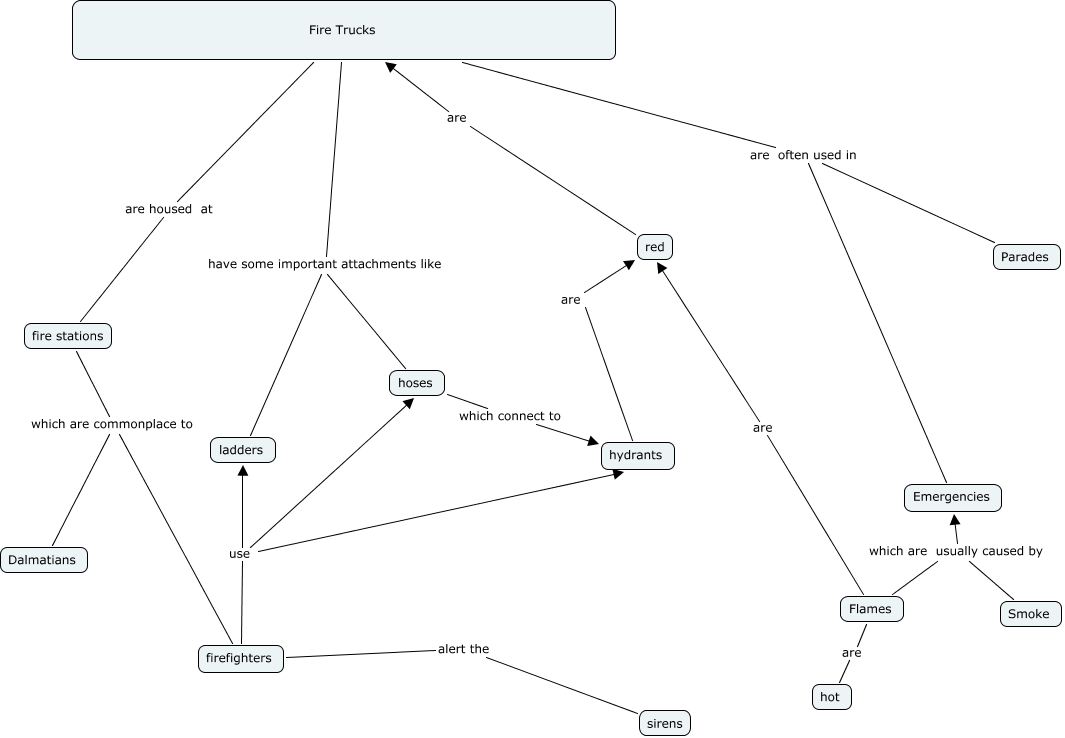 This Concept Map, created with IHMC CmapTools, has information related to: Fire Truck, firefighters use hoses, hoses have some important attachments like ladders, Flames are red, Fire Trucks have some important attachments like ladders, firefighters use hydrants, Fire Trucks are often used in Emergencies, hoses which connect to hydrants, firefighters alert the sirens, Smoke which are usually caused by Emergencies, Fire Trucks are housed at fire stations, Fire Trucks are often used in Parades, firefighters use ladders, hydrants are red, red are Fire Trucks, Flames are hot, fire stations which are commonplace to firefighters, fire stations which are commonplace to Dalmatians, Flames which are usually caused by Emergencies