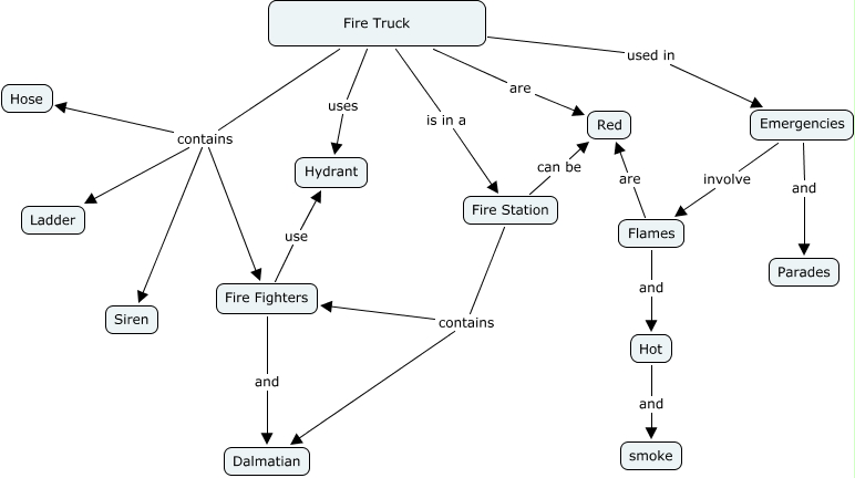 This Concept Map, created with IHMC CmapTools, has information related to: Fire Truck, Fire Fighters and Dalmatian, Fire Station can be Red, Fire Station contains Fire Fighters, Fire Fighters use Hydrant, Fire Truck contains Fire Fighters, Emergencies involve Flames, Fire Truck contains Ladder, Flames are Red, Fire Station contains Dalmatian, Fire Truck used in Emergencies, Fire Truck uses Hydrant, Fire Truck are Red, Fire Truck contains Hose, Fire Truck contains Siren, Fire Truck is in a Fire Station, Emergencies and Parades, Hot and smoke, Flames and Hot