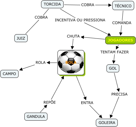Esse mapa conceitual, produzido no IHMC CmapTools, tem a informação relacionada a: FUTEBOL, GANDULA REPÕE BOLA, TORCIDA INCENTIVA OU PRESSIONA JOGADORES, JOGADORES CHUTA BOLA, TORCIDA COBRA JUIZ, TORCIDA COBRA TÉCNICO, JOGADORES TENTAM FAZER GOL, TÉCNICO COMANDA JOGADORES, BOLA ENTRA GOLEIRA, BOLA ROLA CAMPO, GOL PRECISA GOLEIRA
