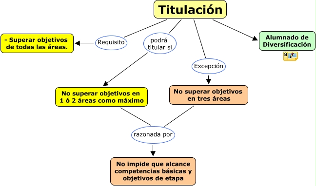 Este Cmap, tiene información relacionada con: titulacion, Titulación podrá titular si No superar objetivos en 1 ó 2 áreas como máximo, Titulación Excepción No superar objetivos en tres áreas, Titulación Alumnado de Diversificación, No superar objetivos en 1 ó 2 áreas como máximo razonada por No impide que alcance competencias básicas y objetivos de etapa, No superar objetivos en tres áreas razonada por No impide que alcance competencias básicas y objetivos de etapa, Titulación Requisito - Superar objetivos de todas las áreas.