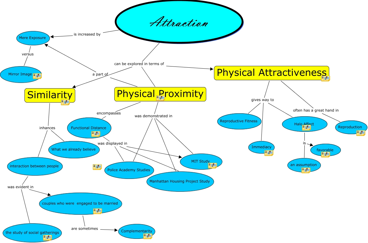 This Concept Map, created with IHMC CmapTools, has information related to: Attraction, Physical Proximity a part of Mere Exposure, Physical Proximity encompasses Functional Distance, Physical Proximity was demonstrated in Police Academy Studies, Attraction can be explored in terms of Physical Attractiveness, Mere Exposure versus Mirror Image, Attraction can be explored in terms of Physical Proximity, Similarity inhances interaction between people, Physical Proximity was demonstrated in Manhattan Housing Project Study, Functional Distance was displayed in MIT Study, Functional Distance was displayed in Police Academy Studies, Physical Attractiveness often has a great hand in Reproduction, Physical Attractiveness gives way to Immediacy, Halo Affect is an assumption, couples who were engaged to be married are sometimes Complementarity, Halo Affect is favorable, Physical Attractiveness gives way to Reproductive Fitness, Attraction is increased by Mere Exposure, interaction between people was evident in couples who were engaged to be married, Physical Proximity was demonstrated in MIT Study, Functional Distance was displayed in Manhattan Housing Project Study