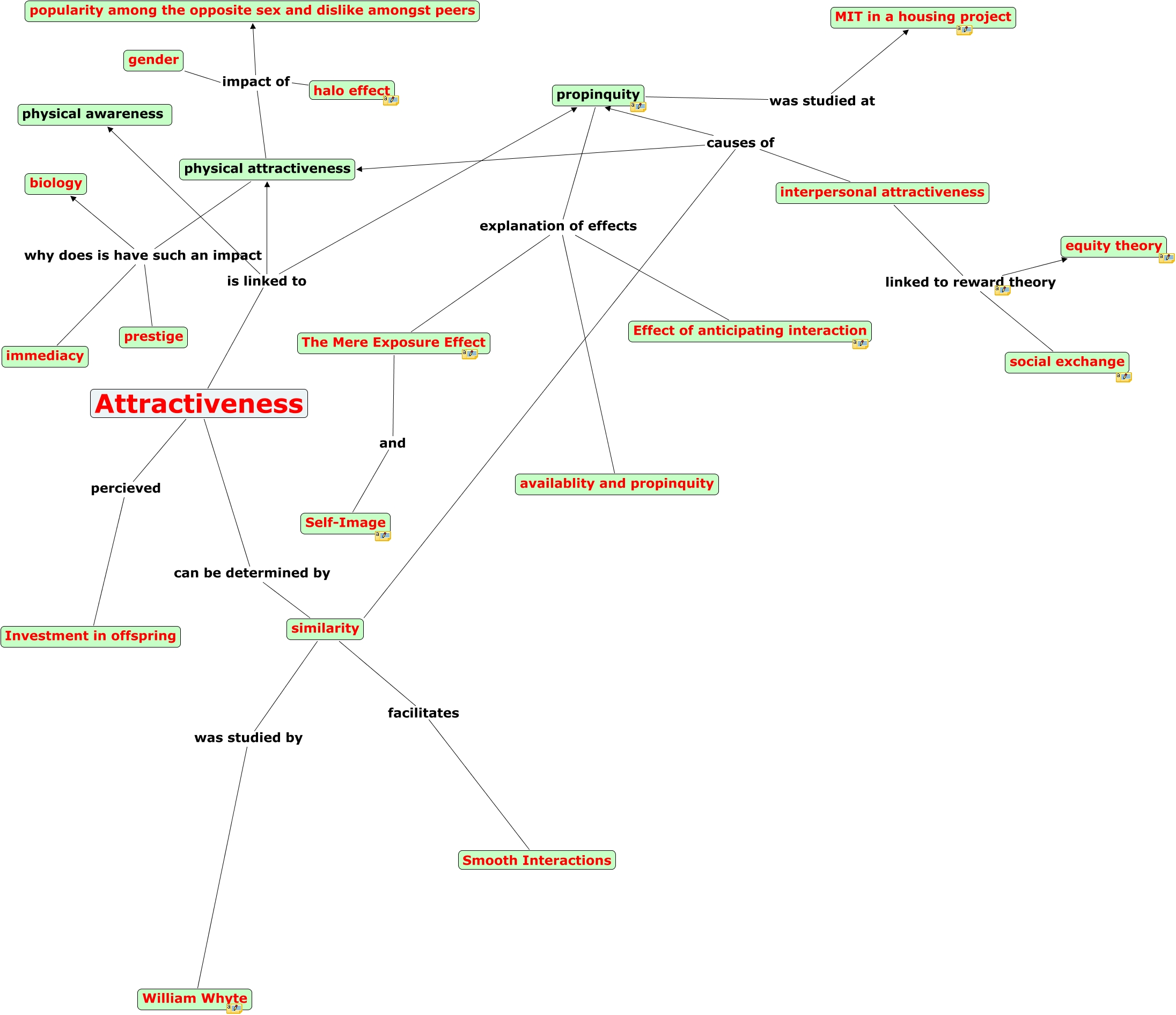 This Concept Map, created with IHMC CmapTools, has information related to: attractiveness, interpersonal attractiveness causes of propinquity, Attractiveness percieved Investment in offspring, interpersonal attractiveness causes of physical attractiveness, similarity facilitates Smooth Interactions, propinquity was studied at MIT in a housing project, Attractiveness is linked to physical attractiveness, propinquity explanation of effects Effect of anticipating interaction, interpersonal attractiveness causes of similarity, propinquity explanation of effects The Mere Exposure Effect, halo effect impact of popularity among the opposite sex and dislike amongst peers, similarity was studied by William Whyte, physical attractiveness why does is have such an impact prestige, physical attractiveness why does is have such an impact biology, Attractiveness can be determined by similarity, propinquity explanation of effects availablity and propinquity, interpersonal attractiveness linked to reward theory equity theory, physical attractiveness impact of popularity among the opposite sex and dislike amongst peers, interpersonal attractiveness linked to reward theory social exchange, The Mere Exposure Effect and Self-Image, Attractiveness is linked to physical awareness