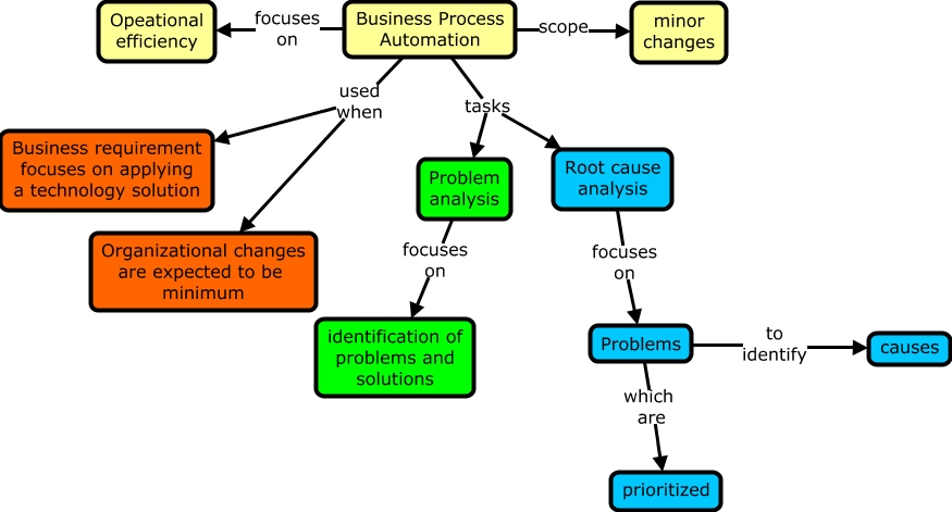 This Concept Map, created with IHMC CmapTools, has information related to: Business Process Automation, Business Process Automation used when Business requirement focuses on applying a technology solution, Root cause analysis focuses on Problems, Business Process Automation scope minor changes, Business Process Automation tasks Root cause analysis, Problems to identify causes, Business Process Automation tasks Problem analysis, Business Process Automation focuses on Opeational efficiency, Problems which are prioritized, Business Process Automation used when Organizational changes are expected to be minimum, Problem analysis focuses on identification of problems and solutions