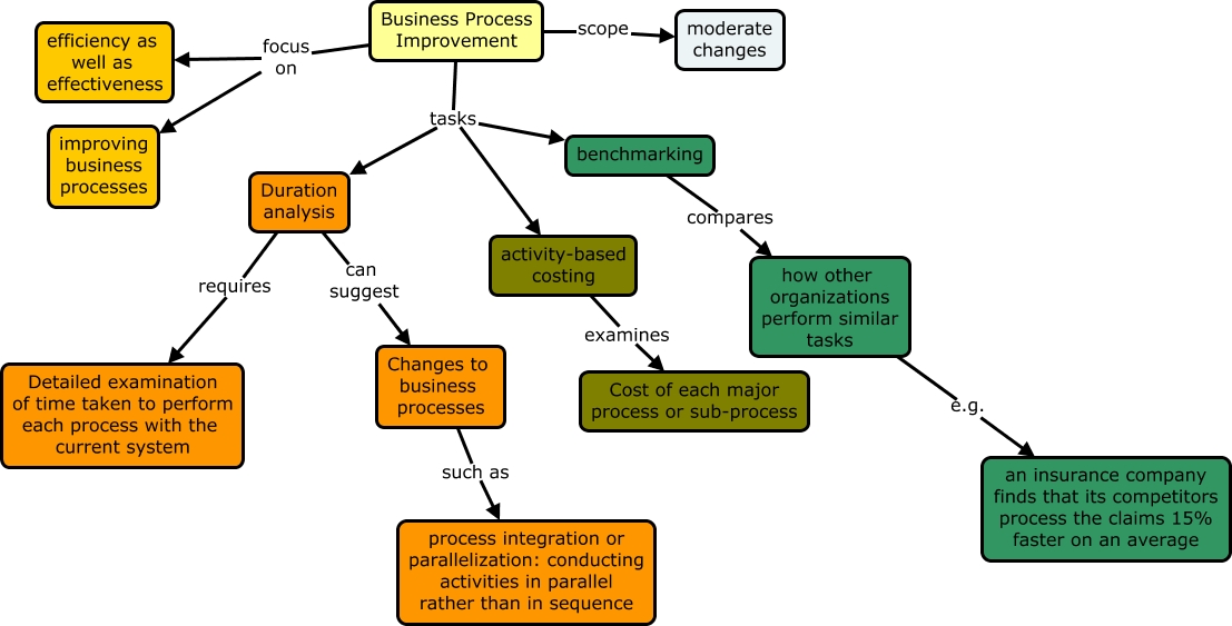 This Concept Map, created with IHMC CmapTools, has information related to: Business Process Improvement, Business Process Improvement scope moderate changes, how other organizations perform similar tasks e.g. an insurance company finds that its competitors process the claims 15% faster on an average, benchmarking compares how other organizations perform similar tasks, Business Process Improvement focus on improving business processes, Business Process Improvement tasks Duration analysis, Business Process Improvement focus on efficiency as well as effectiveness, Changes to business processes such as process integration or parallelization: conducting activities in parallel rather than in sequence, Business Process Improvement tasks benchmarking, Business Process Improvement tasks activity-based costing, Duration analysis can suggest Changes to business processes, activity-based costing examines Cost of each major process or sub-process, Duration analysis requires Detailed examination of time taken to perform each process with the current system