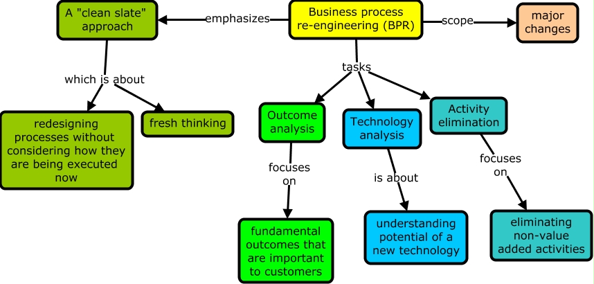 This Concept Map, created with IHMC CmapTools, has information related to: Business Process Reengineering, Technology analysis is about understanding potential of a new technology, Business process re-engineering (BPR) tasks Technology analysis, A "clean slate" approach which is about fresh thinking, A "clean slate" approach which is about redesigning processes without considering how they are being executed now, Business process re-engineering (BPR) emphasizes A "clean slate" approach, Business process re-engineering (BPR) tasks Outcome analysis, Business process re-engineering (BPR) tasks Activity elimination, Outcome analysis focuses on fundamental outcomes that are important to customers, Business process re-engineering (BPR) scope major changes, Activity elimination focuses on eliminating non-value added activities