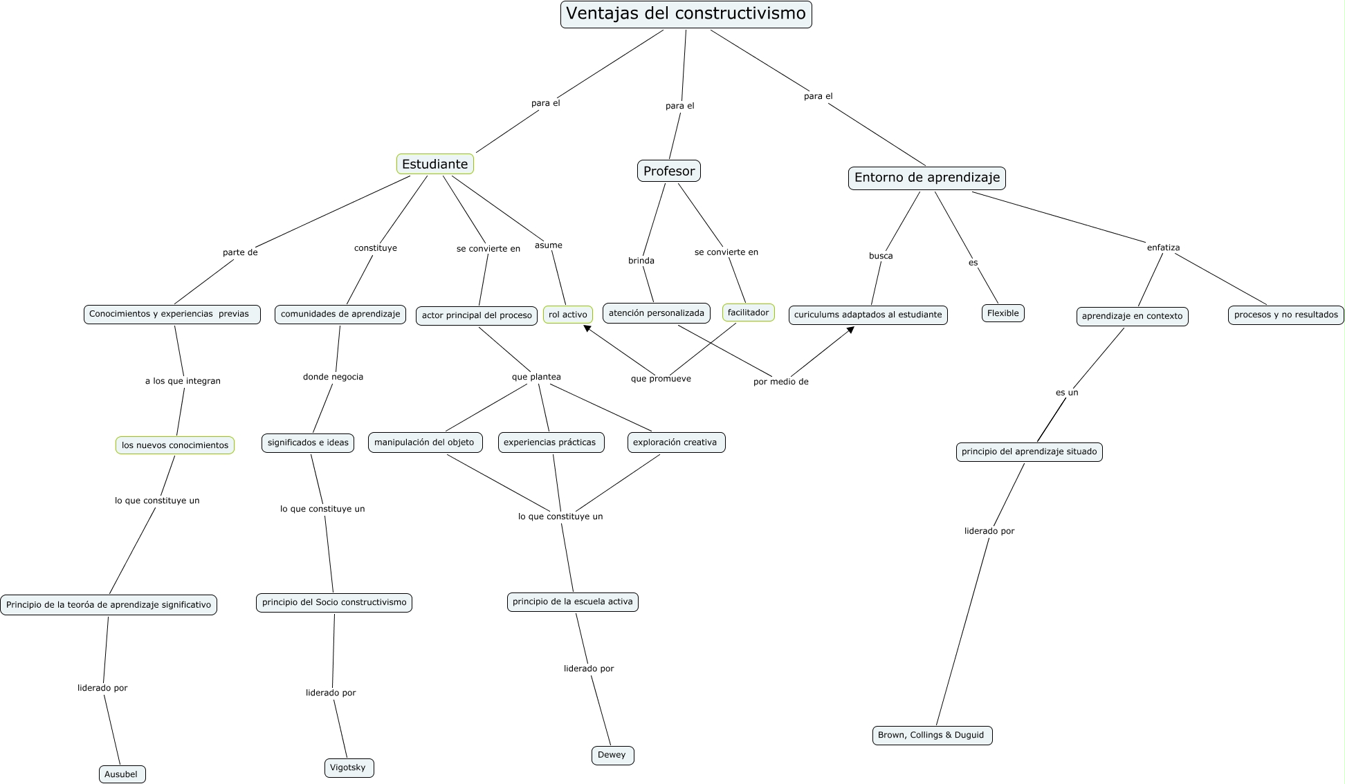 Este Cmap, tiene información relacionada con: ventajas, comunidades de aprendizaje donde negocia significados e ideas, Profesor se convierte en facilitador, principio del aprendizaje situado liderado por Brown, Collings & Duguid, los nuevos conocimientos lo que constituye un Principio de la teoróa de aprendizaje significativo, actor principal del proceso que plantea manipulación del objeto, Ventajas del constructivismo para el Estudiante, experiencias prácticas lo que constituye un principio de la escuela activa, Ventajas del constructivismo para el Profesor, Conocimientos y experiencias previas a los que integran los nuevos conocimientos, principio de la escuela activa liderado por Dewey, Entorno de aprendizaje busca curiculums adaptados al estudiante, aprendizaje en contexto es un principio del aprendizaje situado, actor principal del proceso que plantea exploración creativa, Estudiante parte de Conocimientos y experiencias previas, Entorno de aprendizaje es Flexible, principio del Socio constructivismo liderado por Vigotsky, facilitador que promueve rol activo, actor principal del proceso que plantea experiencias prácticas, Ventajas del constructivismo para el Entorno de aprendizaje, Estudiante constituye comunidades de aprendizaje