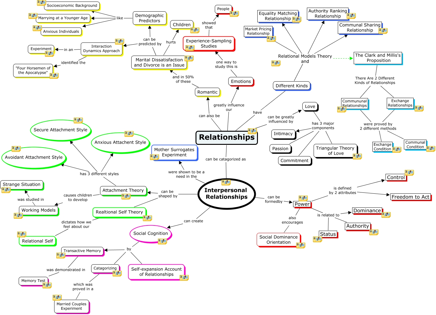 This Concept Map, created with IHMC CmapTools, has information related to: Relationships, Love has 3 major components Commitment, Social Cognition by Self-expansion Account of Relationships, Demographic Predictors like Anxious Individuals, Attachment Theory has 3 different styles Secure Attachment Style, Relationships can be catagorized as Interpersonal Relationships, Exchange Relationships were proved by 2 different methods Exchange Condition, Social Cognition by Transactive Memory, Attachment Theory causes children to develop Working Models, Interpersonal Relationships can create Social Cognition, Power is defined by 2 attributes Freedom to Act, Interpersonal Relationships can be shaped by Realtional Self Theory, Marital Dissatisfaction and Divorce is an Issue can be predicted by Interaction Dynamics Approach, Power also encourages Social Dominance Orientation, Commununal Relationships were proved by 2 different methods Communal Condition, Market Pricing Relationship Relational Models Theory and Communal Sharing Relationship, Market Pricing Relationship Relational Models Theory and Authority Ranking Relationship, Realtional Self Theory dictates how we feel about our Relational Self, Experience-Sampling Studies showed that People, Marital Dissatisfaction and Divorce is an Issue hurts Children, Power is related to Status
