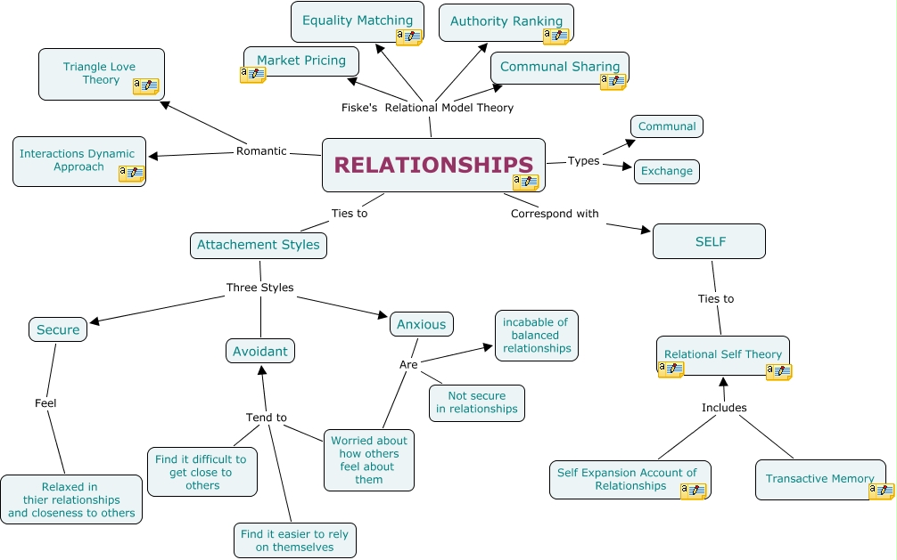 This Concept Map, created with IHMC CmapTools, has information related to: Relationships, Attachement Styles Three Styles Avoidant, RELATIONSHIPS Types Communal, RELATIONSHIPS Fiske's Relational Model Theory Market Pricing, RELATIONSHIPS Correspond with SELF, RELATIONSHIPS Fiske's Relational Model Theory Equality Matching, RELATIONSHIPS Romantic Interactions Dynamic Approach, RELATIONSHIPS Fiske's Relational Model Theory Authority Ranking, Attachement Styles Three Styles Anxious, Anxious Are incabable of balanced relationships, SELF Ties to Relational Self Theory, RELATIONSHIPS Fiske's Relational Model Theory Communal Sharing, Anxious Are Not secure in relationships, Worried about how others feel about them Tend to Avoidant, Secure Feel Relaxed in thier relationships and closeness to others, Self Expansion Account of Relationships Includes Relational Self Theory, Worried about how others feel about them Tend to Find it difficult to get close to others, Transactive Memory Includes Relational Self Theory, Attachement Styles Three Styles Secure, Worried about how others feel about them Tend to Find it easier to rely on themselves, RELATIONSHIPS Romantic Triangle Love Theory