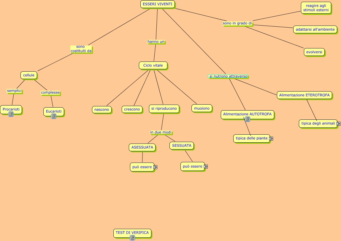 Questa Cmap, creata con IHMC CmapTools, contiene informazioni relative a: esseri viventi, Alimentazione ETEROTROFA distinta in Filtrazione, Alimentazione ETEROTROFA distinta in Predazione, Alimentazione ETEROTROFA distinta in Fagocitosi, ESSERI VIVENTI sono in grado di adattarsi all'ambiente, SESSUATA ???? può essere, ESSERI VIVENTI sono in grado di reagire agli stimoli esterni, Ciclo vitale ???? crescono, Ciclo vitale ???? muoiono, cellule complesse Eucarioti, ESSERI VIVENTI si nutrono attraverso Alimentazione AUTOTROFA, Ciclo vitale ???? nascono, cellule semplici Procarioti, ESSERI VIVENTI si nutrono attraverso Alimentazione ETEROTROFA, ASESSUATA ???? può essere, si riproducono in due modi ASESSUATA, si riproducono in due modi SESSUATA, Alimentazione AUTOTROFA tipica delle piante utilizzando la FOTOSINTESI CLOROFILLIANA, Alimentazione ETEROTROFA distinta in Cellulolisi, ESSERI VIVENTI sono in grado di evolversi, Ciclo vitale ???? si riproducono