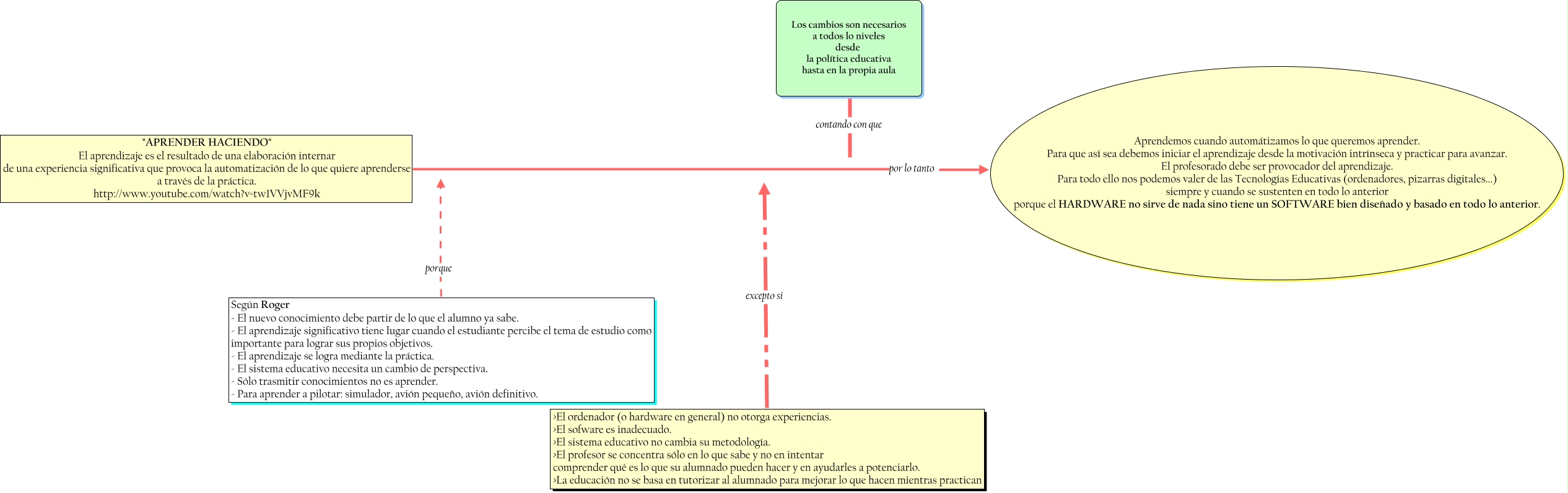 hasta en la propia aula </mtext> </math> contando con que, "APRENDER HACIENDO" El aprendizaje es el resultado de una elaboración internar de una experiencia significativa que provoca la automatización de lo que quiere aprenderse a través de la práctica. http://www.youtube.com/watch?v=tw1VVjvMF9k por lo tanto Aprendemos cuando automátizamos lo que queremos aprender. Para que así sea debemos iniciar el aprendizaje desde la motivación intrínseca y practicar para avanzar. El profesorado debe ser provocador del aprendizaje. Para todo ello nos podemos valer de las Tecnologías Educativas (ordenadores, pizarras digitales...) siempre y cuando se sustenten en todo lo anterior porque el HARDWARE no sirve de nada sino tiene un SOFTWARE bien diseñado y basado en todo lo anterior., Según Roger - El nuevo conocimiento debe partir de lo que el alumno ya sabe. - El aprendizaje significativo tiene lugar cuando el estudiante percibe el tema de estudio como importante para lograr sus propios objetivos. - El aprendizaje se logra mediante la práctica. - El sistema educativo necesita un cambio de perspectiva. - Sólo trasmitir conocimientos no es aprender. - Para aprender a pilotar: simulador, avión pequeño, avión definitivo. porque, >El ordenador (o hardware en general) no otorga experiencias. >El sofware es inadecuado. >El sistema educativo no cambia su metodología. >El profesor se concentra sólo en lo que sabe y no en intentar comprender qué es lo que su alumnado pueden hacer y en ayudarles a potenciarlo. >La educación no se basa en tutorizar al alumnado para mejorar lo que hacen mientras practican excepto si