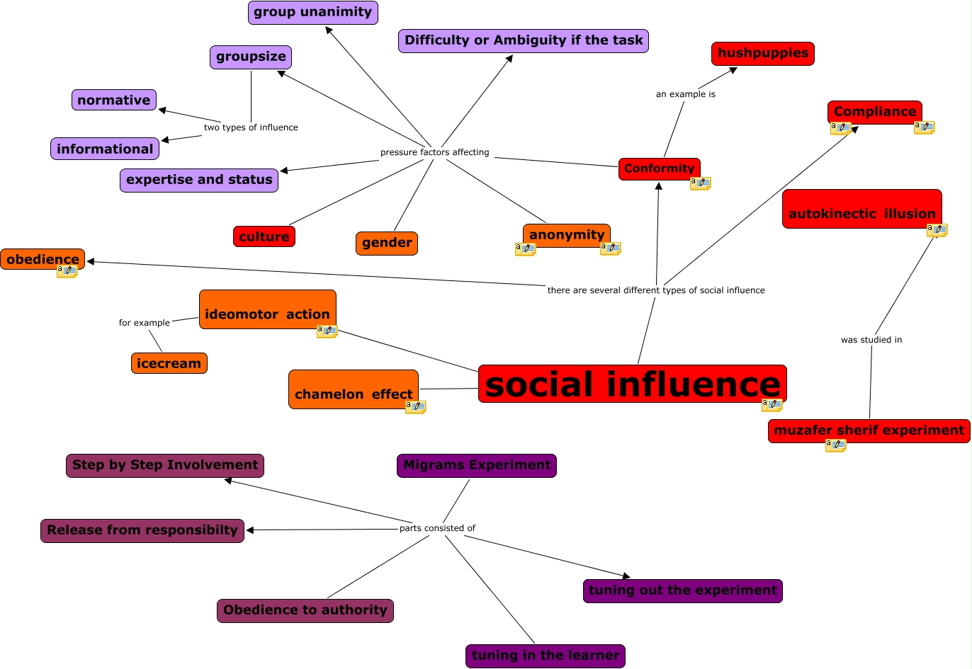 This Concept Map, created with IHMC CmapTools, has information related to: Social Influence, Conformity pressure factors affecting anonymity, Conformity pressure factors affecting culture, Conformity pressure factors affecting Difficulty or Ambiguity if the task, Conformity pressure factors affecting gender, social influence there are several different types of social influence Conformity, Migrams Experiment parts consisted of tuning out the experiment, Conformity pressure factors affecting group unanimity, muzafer sherif experiment was studied in autokinectic illusion, social influence there are several different types of social influence Compliance, Conformity pressure factors affecting groupsize, ideomotor action ???? social influence, social influence there are several different types of social influence obedience, Conformity an example is hushpuppies, Migrams Experiment parts consisted of Obedience to authority, chamelon effect ???? social influence, Migrams Experiment parts consisted of Release from responsibilty, groupsize two types of influence informational, Conformity pressure factors affecting expertise and status, Migrams Experiment parts consisted of Step by Step Involvement, ideomotor action for example icecream