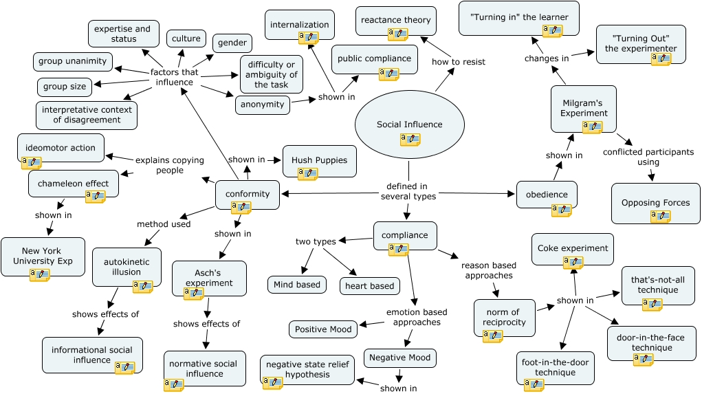 This Concept Map, created with IHMC CmapTools, has information related to: Social Influence, norm of reciprocity shown in foot-in-the-door technique, conformity factors that influence interpretative context of disagreement, Social Influence defined in several types conformity, compliance emotion based approaches Positive Mood, anonymity shown in internalization, conformity explains copying people ideomotor action, Social Influence how to resist reactance theory, Milgram's Experiment conflicted participants using Opposing Forces, Milgram's Experiment changes in "Turning Out" the experimenter, compliance emotion based approaches Negative Mood, norm of reciprocity shown in door-in-the-face technique, conformity factors that influence group unanimity, compliance reason based approaches norm of reciprocity, obedience shown in Milgram's Experiment, conformity shown in Hush Puppies, Social Influence defined in several types obedience, norm of reciprocity shown in that's-not-all technique, compliance two types heart based, conformity method used autokinetic illusion, Milgram's Experiment changes in "Turning in" the learner