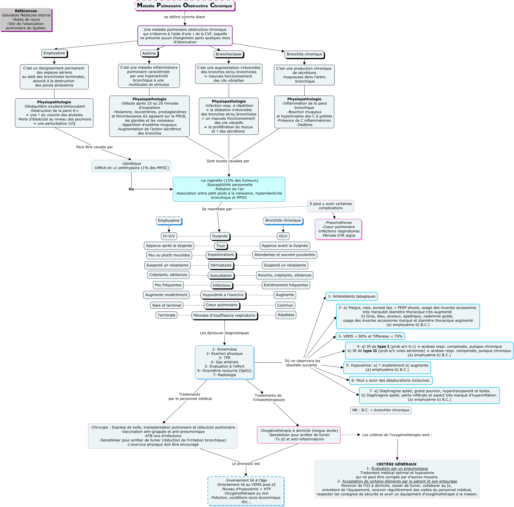 Cette carte de concepts créée avec IHMC CmapTools traite de: MPOC2, ⋅Génétique ⋅Déficit en α1-antitrypsine (1% des MPOC) Ou ⋅La cigarette (15% des fumeurs) ⋅Susceptibilité personnelle ⋅Pollution de l'air ⋅Association entre petit poids à la naissance, hyperréactivité bronchique et MPOC, Bronchiectasie C'est une augmentation irréversible des bronches et/ou bronchioles ⇒ mauvais fonctionnement des cils vibratiles, ⋅Chirurgie : Exprèse de bulle, transplantation pulmonaire et réduction pulmonaire ⋅Vaccination anti-grippale et anti-pneumonique ⋅ATB lors d'infections ⋅Sensibiliser pour arrêter de fumer (réduction de l'irritation bronchique) ⋅L'exercice physique doit être encouragé Le pronostic est ⋅Inversement lié à l'âge ⋅Directement lié au VEMS post β2 ⋅Niveau d'hypoxémie + HTP ⋅Oxygénothérapie ou non ⋅Pollution, conditions socio-économique ⋅Etc..., ⋅La cigarette (15% des fumeurs) ⋅Susceptibilité personnelle ⋅Pollution de l'air ⋅Association entre petit poids à la naissance, hyperréactivité bronchique et MPOC Se manifeste par Dyspnée, Toux Apparue après la dyspnée, C'est une production chronique de sécrétions muqueuses dans l'arbre bronchique Physiopathologie ⋅Inflammation de la paroi bronchique ⋅Bouchon muqueux et hypertrophie des C à goblets ⋅Présence de C inflammatoires ⋅Oedème, Physiopathologie ⋅Débute après 10 ou 20 minutes d'exposition ⋅Histamine, leucotriènes, prostaglandines et thromboxanes A2 agissent sur la FMLB, les glandes et les vaisseaux ⋅Apparition d'oedème muqueux ⋅Augmentation de l'action sécrétrice des bronches Sont toutes causées par ⋅La cigarette (15% des fumeurs) ⋅Susceptibilité personnelle ⋅Pollution de l'air ⋅Association entre petit poids à la naissance, hyperréactivité bronchique et MPOC, C'est une augmentation irréversible des bronches et/ou bronchioles ⇒ mauvais fonctionnement des cils vibratiles Physiopathologie ⋅Infection resp. à répétition ⇒ la dilatation irréversible des bronches et/ou bronchioles + un mauvais fonctionnement des cils vibratifs ⇒ la prolifération du mucus et ↑ des sécrétions, Infections Extrêmement fréquentes, Physiopathologie ⋅Inflammation de la paroi bronchique ⋅Bouchon muqueux et hypertrophie des C à goblets ⋅Présence de C inflammatoires ⋅Oedème Sont toutes causées par ⋅La cigarette (15% des fumeurs) ⋅Susceptibilité personnelle ⋅Pollution de l'air ⋅Association entre petit poids à la naissance, hyperréactivité bronchique et MPOC, ⋅Oxygénothérapie à domicile (longue durée) ⋅Sensibiliser pour arrêter de fumer ⋅Tx β2 et anti-inflammatoire ???? Les critères de l'oxygénothérapie sont :, Une maladie pulmonaire obstructive chronique qui s'observe à l'aide d'une ↓ de la CVF, laquelle ne présente aucun changement après quelques mois d'observation Bronchite chronique, Bronchite chronique III/V, Où on observera les résultats suivants 4- a) IR de type I (prob a/n A-c) ⇒ acidose respi. compensée, puisque chronique b) IR de type II (prob a/n voies aériennes) ⇒ acidose respi. compensée, puisque chronique (a) emphysème b) B.C.), Où on observera les résultats suivants 5- Hypoxémie: a) ↑ modérément b) augmente (a) emphysème b) B.C.), Hémoptysie Suspecté un néoplasme, Périodes d'insuffisance respiratoire Les épreuves diagnostiques 1- Amamnèse 2- Examen physique 3- TFR 4- Gaz artériels 5- Évaluation à l'effort 6- Oxymétrie nocturne (SpO2) 7- Radiologie, ⋅Chirurgie : Exprèse de bulle, transplantation pulmonaire et réduction pulmonaire ⋅Vaccination anti-grippale et anti-pneumonique ⋅ATB lors d'infections ⋅Sensibiliser pour arrêter de fumer (réduction de l'irritation bronchique) ⋅L'exercice physique doit être encouragé Le pronostic est ⋅Oxygénothérapie à domicile (longue durée) ⋅Sensibiliser pour arrêter de fumer ⋅Tx β2 et anti-inflammatoire, Coeur pulmonaire Rare et terminal, Auscultation Crépitants, sibilances