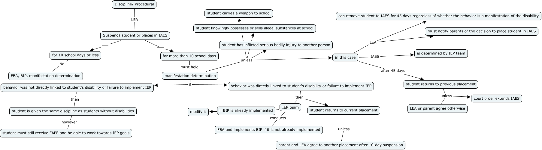 This Concept Map, created with IHMC CmapTools, has information related to: Leah Huyck - Discipline Procedural, in this case after 45 days student returns to previous placement, student is given the same discipline as students without disabilities however student must still receive FAPE and be able to work towards IEP goals, manifestation determination unless student knowingly possesses or sells illegal substances at school, student returns to previous placement unless LEA or parent agree otherwise, in this case LEA must notify parents of the decision to place student in IAES, behavior was directly linked to student's disability or failure to implement IEP then student returns to current placement, manifestation determination unless student has inflicted serious bodily injury to another person, IEP team conducts FBA and implements BIP if it is not already implemented, manifestation determination unless student carries a weapon to school, Suspends student or places in IAES ---- for more than 10 school days, in this case LEA can remove student to IAES for 45 days regardless of whether the behavior is a manifestation of the disability, for more than 10 school days must hold manifestation determination, student returns to previous placement unless court order extends IAES, manifestation determination if behavior was directly linked to student's disability or failure to implement IEP, behavior was not directly linked to student's disability or failure to implement IEP then student is given the same discipline as students without disabilities, if BIP is already implemented ---- modify it, Suspends student or places in IAES ---- for 10 school days or less, student returns to current placement unless parent and LEA agree to another placement after 10-day suspension, in this case IAES is determined by IEP team, manifestation determination if behavior was not directly linked to student's disability or failure to implement IEP