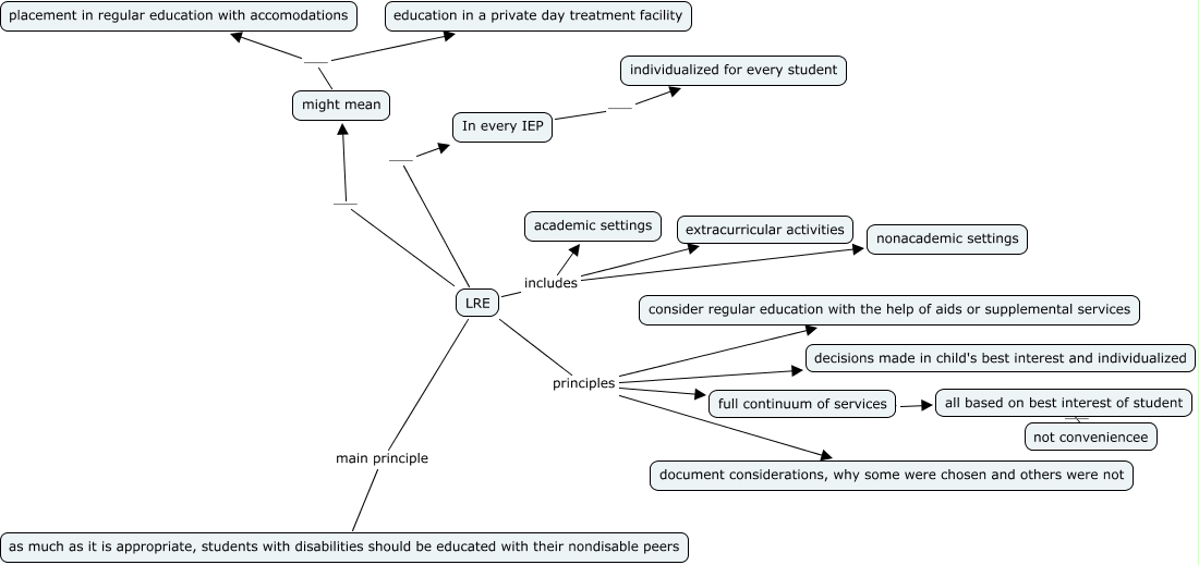 This Concept Map, created with IHMC CmapTools, has information related to: Leah Huyck - LRE, all based on best interest of student ---- not conveniencee, LRE ---- might mean, In every IEP ---- individualized for every student, LRE ---- In every IEP, LRE includes nonacademic settings, full continuum of services ---- all based on best interest of student, LRE main principle as much as it is appropriate, students with disabilities should be educated with their nondisable peers, might mean ---- education in a private day treatment facility, LRE includes academic settings, might mean ---- placement in regular education with accomodations, LRE principles document considerations, why some were chosen and others were not, LRE principles consider regular education with the help of aids or supplemental services, LRE includes extracurricular activities, LRE principles decisions made in child's best interest and individualized, LRE principles full continuum of services
