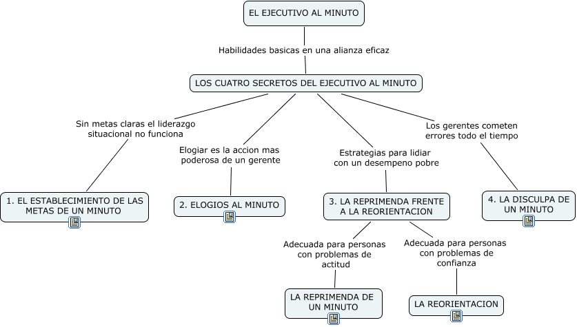 Este Cmap, tiene información relacionada con: Capitulo 8, EL EJECUTIVO AL MINUTO Habilidades basicas en una alianza eficaz LOS CUATRO SECRETOS DEL EJECUTIVO AL MINUTO, LOS CUATRO SECRETOS DEL EJECUTIVO AL MINUTO Estrategias para lidiar con un desempeno pobre 3. LA REPRIMENDA FRENTE A LA REORIENTACION, LOS CUATRO SECRETOS DEL EJECUTIVO AL MINUTO Los gerentes cometen errores todo el tiempo 4. LA DISCULPA DE UN MINUTO, LOS CUATRO SECRETOS DEL EJECUTIVO AL MINUTO Sin metas claras el liderazgo situacional no funciona 1. EL ESTABLECIMIENTO DE LAS METAS DE UN MINUTO, LOS CUATRO SECRETOS DEL EJECUTIVO AL MINUTO Elogiar es la accion mas poderosa de un gerente 2. ELOGIOS AL MINUTO, 3. LA REPRIMENDA FRENTE A LA REORIENTACION Adecuada para personas con problemas de actitud LA REPRIMENDA DE UN MINUTO, 3. LA REPRIMENDA FRENTE A LA REORIENTACION Adecuada para personas con problemas de confianza LA REORIENTACION
