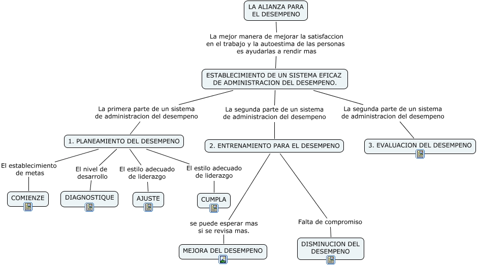 Este Cmap, tiene información relacionada con: Capitulo 7, ESTABLECIMIENTO DE UN SISTEMA EFICAZ DE ADMINISTRACION DEL DESEMPENO. La primera parte de un sistema de administracion del desempeno 1. PLANEAMIENTO DEL DESEMPENO, LA ALIANZA PARA EL DESEMPENO La mejor manera de mejorar la satisfaccion en el trabajo y la autoestima de las personas es ayudarlas a rendir mas ESTABLECIMIENTO DE UN SISTEMA EFICAZ DE ADMINISTRACION DEL DESEMPENO., ESTABLECIMIENTO DE UN SISTEMA EFICAZ DE ADMINISTRACION DEL DESEMPENO. La segunda parte de un sistema de administracion del desempeno 2. ENTRENAMIENTO PARA EL DESEMPENO, ESTABLECIMIENTO DE UN SISTEMA EFICAZ DE ADMINISTRACION DEL DESEMPENO. La segunda parte de un sistema de administracion del desempeno 3. EVALUACION DEL DESEMPENO, 2. ENTRENAMIENTO PARA EL DESEMPENO se puede esperar mas si se revisa mas. MEJORA DEL DESEMPENO, 1. PLANEAMIENTO DEL DESEMPENO El estilo adecuado de liderazgo CUMPLA, 2. ENTRENAMIENTO PARA EL DESEMPENO Falta de compromiso DISMINUCION DEL DESEMPENO, 1. PLANEAMIENTO DEL DESEMPENO El establecimiento de metas COMIENZE, 1. PLANEAMIENTO DEL DESEMPENO El estilo adecuado de liderazgo AJUSTE, 1. PLANEAMIENTO DEL DESEMPENO El nivel de desarrollo DIAGNOSTIQUE