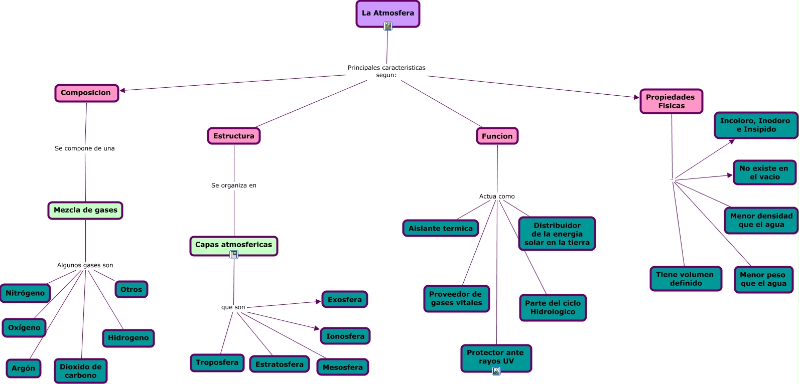 Este Cmap, tiene información relacionada con: La Atmosfera 2, Funcion Actua como Protector ante rayos UV, Mezcla de gases Algunos gases son Argón, Capas atmosfericas que son Estratosfera, Propiedades Fisicas - No existe en el vacio, Mezcla de gases Algunos gases son Nitrógeno, La Atmosfera Principales caracteristicas segun: Propiedades Fisicas, Funcion Actua como Parte del ciclo Hidrologico, La Atmosfera Principales caracteristicas segun: Estructura, Composicion Se compone de una Mezcla de gases, Capas atmosfericas que son Exosfera, Funcion Actua como Aislante termica, Capas atmosfericas que son Mesosfera, Funcion Actua como Proveedor de gases vitales, Mezcla de gases Algunos gases son Hidrogeno, Propiedades Fisicas - Tiene volumen definido, Funcion Actua como Distribuidor de la energia solar en la tierra, Estructura Se organiza en Capas atmosfericas, Capas atmosfericas que son Troposfera, Propiedades Fisicas - Menor densidad que el agua, Mezcla de gases Algunos gases son Dioxido de carbono