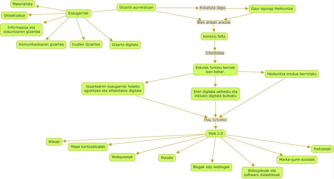 This Concept Map has information related to: IKTak, hezkuntza aireberritzeko aitzakia (Leire Etxeberria), Ezaugarriak ???? Gizarte digitala, Web 2.0 Web 2.0 Moodle, Web 2.0 Web 2.0 Mapa kontzeptualak, Ezaugarriak ???? Irudien Gizartea, Web 2.0 Web 2.0 Marka-gune sozialak, konexio falta Irtenbidea Eskolak funtzio berriak izan behar., Web 2.0 Web 2.0 Wikiak, Ezaugarriak ???? Komunikazioaren gizartea, Eskolak funtzio berriak izan behar. ???? Gizartearen ezaugarriei hobeto egokitzea eta alfabetatze digitala, Web 2.0 Web 2.0 Blogak edo weblogak
