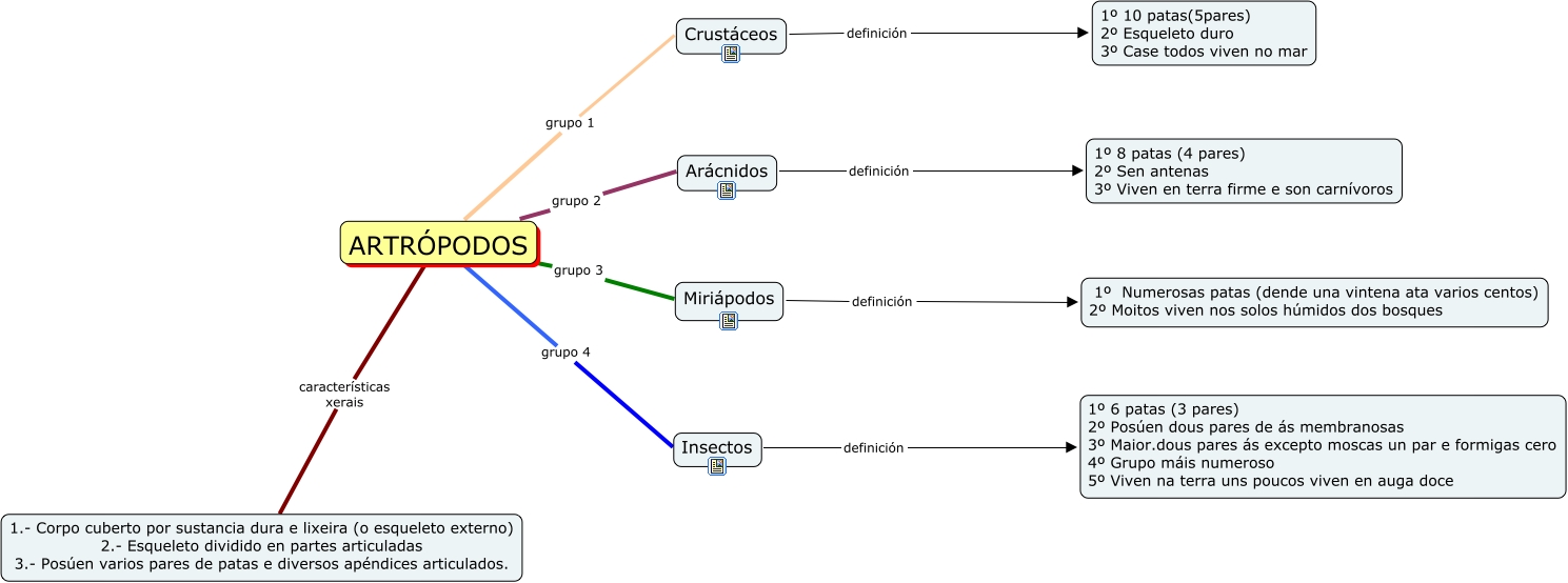 Este Cmap, tiene información relacionada con: Tema 10 — Artrópodos, ARTRÓPODOS características xerais 1.- Corpo cuberto por sustancia dura e lixeira (o esqueleto externo) 2.- Esqueleto dividido en partes articuladas 3.- Posúen varios pares de patas e diversos apéndices articulados., Insectos definición 1º 6 patas (3 pares) 2º Posúen dous pares de ás membranosas 3º Maior.dous pares ás excepto moscas un par e formigas cero 4º Grupo máis numeroso 5º Viven na terra uns poucos viven en auga doce, ARTRÓPODOS grupo 4 Insectos, ARTRÓPODOS grupo 3 Miriápodos, Crustáceos definición 1º 10 patas(5pares) 2º Esqueleto duro 3º Case todos viven no mar, Miriápodos definición 1º Numerosas patas (dende una vintena ata varios centos) 2º Moitos viven nos solos húmidos dos bosques, Arácnidos definición 1º 8 patas (4 pares) 2º Sen antenas 3º Viven en terra firme e son carnívoros