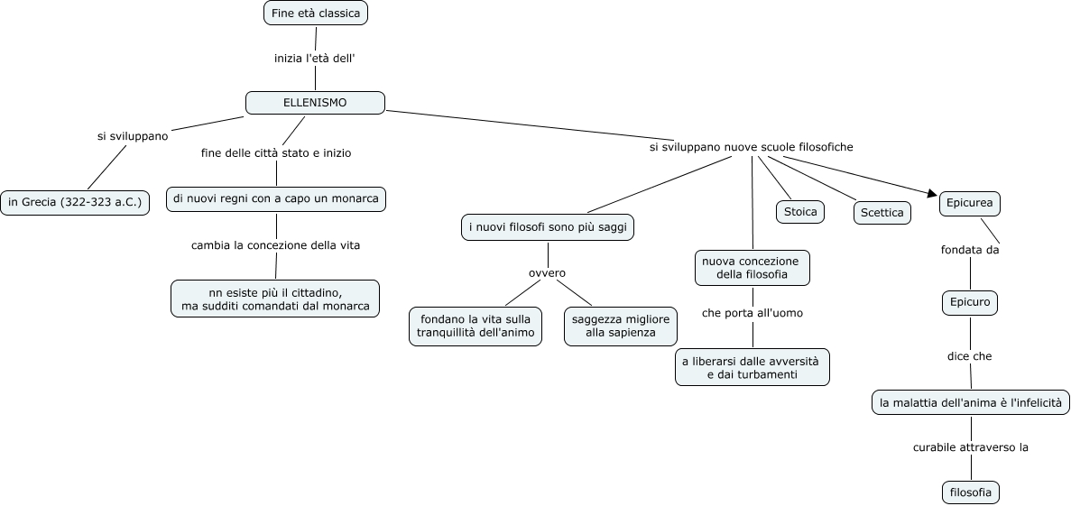 ellenismo Eric, la malattia dell'anima è l'infelicità curabile attraverso la filosofia, Epicuro dice che la malattia dell'anima è l'infelicità, ELLENISMO si sviluppano nuove scuole filosofiche Stoica, ELLENISMO si sviluppano nuove scuole filosofiche Epicurea, ELLENISMO si sviluppano nuove scuole filosofiche Scettica, di nuovi regni con a capo un monarca cambia la concezione della vita nn esiste più il cittadino, ma sudditi comandati dal monarca, i nuovi filosofi sono più saggi ovvero saggezza migliore alla sapienza, Fine età classica inizia l'età dell' ELLENISMO, nuova concezione della filosofia che porta all'uomo a liberarsi dalle avversità e dai turbamenti, i nuovi filosofi sono più saggi ovvero fondano la vita sulla tranquillità dell'animo