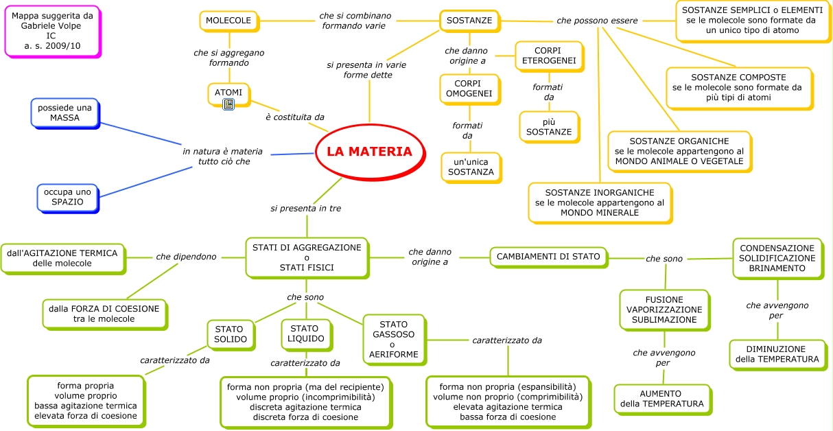 Questa Cmap, creata con IHMC CmapTools, contiene informazioni relative a: LA MATERIA, STATO GASSOSO o AERIFORME caratterizzato da forma non propria (espansibilità) volume non proprio (comprimibilità) elevata agitazione termica bassa forza di coesione, STATI DI AGGREGAZIONE o STATI FISICI che dipendono dall'AGITAZIONE TERMICA delle molecole, LA MATERIA è costituita da ATOMI, SOSTANZE che possono essere SOSTANZE SEMPLICI o ELEMENTI se le molecole sono formate da un unico tipo di atomo, LA MATERIA in natura è materia tutto ciò che possiede una MASSA, CORPI ETEROGENEI formati da più SOSTANZE, SOSTANZE che danno origine a CORPI ETEROGENEI, STATI DI AGGREGAZIONE o STATI FISICI che sono STATO SOLIDO, STATI DI AGGREGAZIONE o STATI FISICI che sono STATO GASSOSO o AERIFORME, SOSTANZE che possono essere SOSTANZE COMPOSTE se le molecole sono formate da più tipi di atomi, FUSIONE VAPORIZZAZIONE SUBLIMAZIONE che avvengono per AUMENTO della TEMPERATURA, SOSTANZE che possono essere SOSTANZE ORGANICHE se le molecole appartengono al MONDO ANIMALE O VEGETALE, CONDENSAZIONE SOLIDIFICAZIONE BRINAMENTO che avvengono per DIMINUZIONE della TEMPERATURA, MOLECOLE che si combinano formando varie SOSTANZE, ATOMI che si aggregano formando MOLECOLE, SOSTANZE che danno origine a CORPI OMOGENEI, CAMBIAMENTI DI STATO che sono FUSIONE VAPORIZZAZIONE SUBLIMAZIONE, LA MATERIA in natura è materia tutto ciò che occupa uno SPAZIO, STATI DI AGGREGAZIONE o STATI FISICI che sono STATO LIQUIDO, SOSTANZE che possono essere SOSTANZE INORGANICHE se le molecole appartengono al MONDO MINERALE
