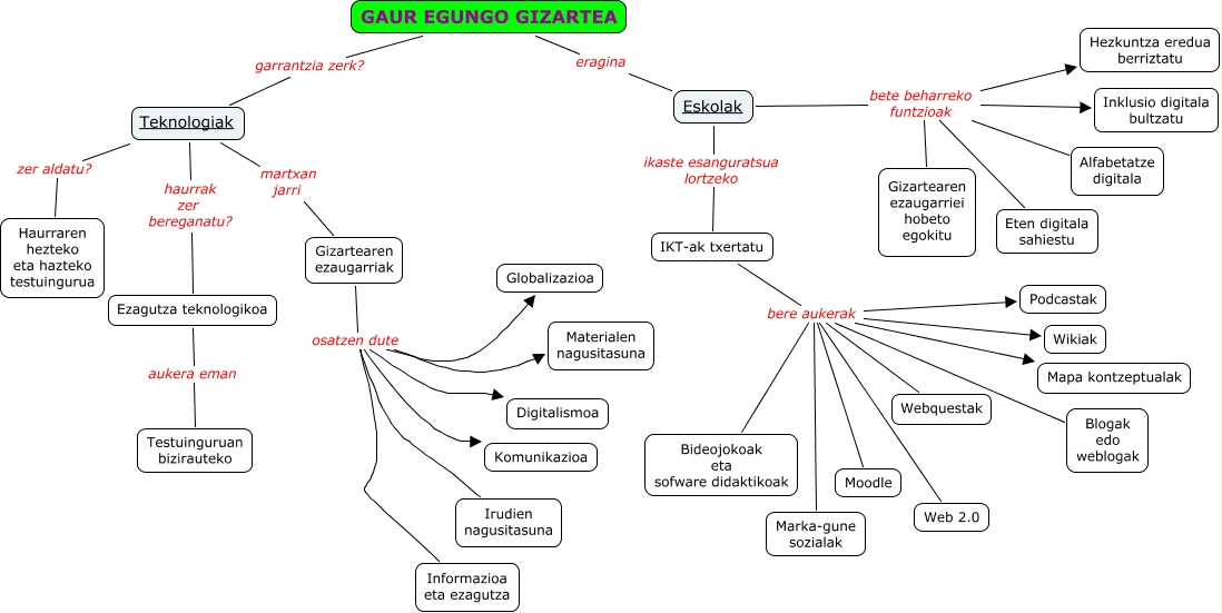 Este Cmap, tiene información relacionada con: Itsasne Landa, Gizartearen ezaugarriak osatzen dute Komunikazioa, Gizartearen ezaugarriak osatzen dute Irudien nagusitasuna, Gizartearen ezaugarriak osatzen dute Informazioa eta ezagutza, IKT-ak txertatu bere aukerak Webquestak, IKT-ak txertatu bere aukerak Web 2.0, Ezagutza teknologikoa aukera eman Testuinguruan bizirauteko, IKT-ak txertatu bere aukerak Podcastak, Eskolak bete beharreko funtzioak Hezkuntza eredua berriztatu, Teknologiak haurrak zer bereganatu? Ezagutza teknologikoa, IKT-ak txertatu bere aukerak Bideojokoak eta sofware didaktikoak, Eskolak bete beharreko funtzioak Gizartearen ezaugarriei hobeto egokitu, Eskolak bete beharreko funtzioak Eten digitala sahiestu, Gizartearen ezaugarriak osatzen dute Materialen nagusitasuna, GAUR EGUNGO GIZARTEA garrantzia zerk? Teknologiak, IKT-ak txertatu bere aukerak Marka-gune sozialak, IKT-ak txertatu bere aukerak Moodle, Eskolak bete beharreko funtzioak Alfabetatze digitala, Gizartearen ezaugarriak osatzen dute Globalizazioa, GAUR EGUNGO GIZARTEA eragina Eskolak, Teknologiak zer aldatu? Haurraren hezteko eta hazteko testuingurua