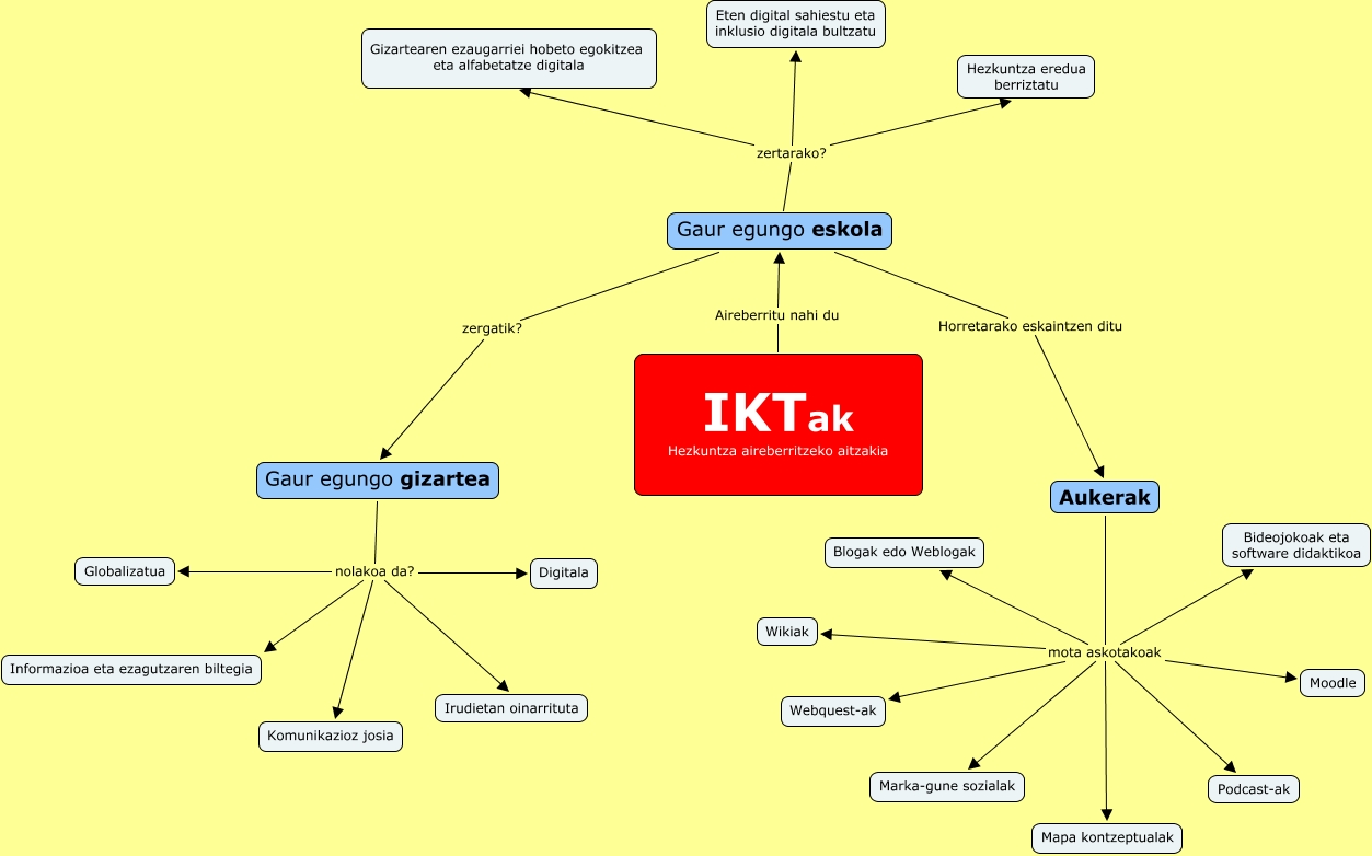 Este Cmap, tiene información relacionada con: ivan palacios martinez, Aukerak mota askotakoak Wikiak, Gaur egungo eskola zertarako? Hezkuntza eredua berriztatu, Aukerak mota askotakoak Bideojokoak eta software didaktikoa, Aukerak mota askotakoak Blogak edo Weblogak, Aukerak mota askotakoak Podcast-ak, Gaur egungo eskola zertarako? Eten digital sahiestu eta inklusio digitala bultzatu, Gaur egungo gizartea nolakoa da? Irudietan oinarrituta, Aukerak mota askotakoak Webquest-ak, Gaur egungo gizartea nolakoa da? Komunikazioz josia, IKTak Hezkuntza aireberritzeko aitzakia Aireberritu nahi du Gaur egungo eskola, Gaur egungo eskola zergatik? Gaur egungo gizartea, Aukerak mota askotakoak Moodle, Aukerak mota askotakoak Marka-gune sozialak, Gaur egungo gizartea nolakoa da? Informazioa eta ezagutzaren biltegia, Gaur egungo eskola Horretarako eskaintzen ditu Aukerak, Aukerak mota askotakoak Mapa kontzeptualak, Gaur egungo gizartea nolakoa da? Globalizatua, Gaur egungo eskola zertarako? Gizartearen ezaugarriei hobeto egokitzea eta alfabetatze digitala, Gaur egungo gizartea nolakoa da? Digitala