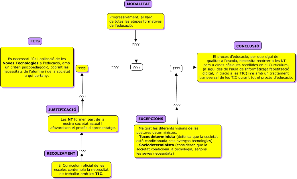 Este Cmap, tiene información relacionada con: Villalón_Charo_amap_síntesi_transversalitat, El Currículum oficial de les escoles contempla la necessitat de treballar amb les TIC. ???? ????, És necessari l'ús i aplicació de les Noves Tecnologies a l'educació, amb un criteri psicopedagògic, cobrint les necessitats de l'alumne i de la societat a qui pertany. ???? El procés d'educació, per que sigui de qualitat a l'escola, necessita recórrer a les NT com a eines bàsiques recollides en el Currículum, ja sigui des de l'aula de Informàtica(alfabetització digital, iniciació a les TIC) i/o amb un tractament transversal de les TIC durant tot el procés d'educació., Les NT formen part de la nostra societat actual i afavoreixen el procés d'aprenentatge. ???? ????, Malgrat les diferents visions de les postures deterministes: - Tecnodeterminista (defensa que la societat està condicionada pels avenços tecnològics) - Sociodeterminista (consideren que la societat condiciona la tecnologia, segons les seves necessitats) ???? ????, Progressivament, al llarg de totes les etapes formatives de l'educació. ???? ????