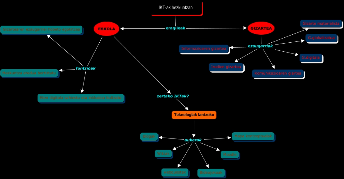 Este Cmap, tiene información relacionada con: julen salaberria, IKT-ak hezkuntzan eragileak ESKOLA, ESKOLA funtzioak Eten digitala sahiestu eta inklusioa bultzatu, ESKOLA zertako IKTak? Teknologiak lantzeko, Teknologiak lantzeko aukerak Moodle, GIZARTEA ezaugarriak Informazioaren gizartea, ESKOLA funtzioak Hezkuntza eredua berriztatu, Teknologiak lantzeko aukerak webquestak, GIZARTEA ezaugarriak Komunikazioaren giartea, IKT-ak hezkuntzan eragileak GIZARTEA, Teknologiak lantzeko aukerak Mapa kontzeptualak, GIZARTEA ezaugarriak Irudien gizartea, Teknologiak lantzeko aukerak Blogak, Teknologiak lantzeko aukerak Wikiak, GIZARTEA ezaugarriak G.globalizatua, GIZARTEA ezaugarriak G.digitala, ESKOLA funtzioak Gizartearen ezaugarriei hobeto egokitzea, GIZARTEA ezaugarriak Gizarte materialista, Teknologiak lantzeko aukerak Bideojokoak