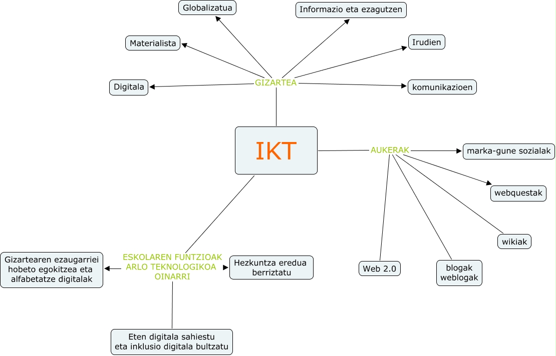 Este Cmap, tiene información relacionada con: Maier Zaldua, IKT GIZARTEA Globalizatua, IKT GIZARTEA Irudien, IKT AUKERAK webquestak, IKT GIZARTEA Materialista, IKT ESKOLAREN FUNTZIOAK ARLO TEKNOLOGIKOA OINARRI Eten digitala sahiestu eta inklusio digitala bultzatu, IKT AUKERAK wikiak, IKT AUKERAK blogak weblogak, IKT AUKERAK Web 2.0, IKT ESKOLAREN FUNTZIOAK ARLO TEKNOLOGIKOA OINARRI Gizartearen ezaugarriei hobeto egokitzea eta alfabetatze digitalak, IKT GIZARTEA Digitala, IKT GIZARTEA Informazio eta ezagutzen, IKT AUKERAK marka-gune sozialak, IKT ESKOLAREN FUNTZIOAK ARLO TEKNOLOGIKOA OINARRI Hezkuntza eredua berriztatu, IKT GIZARTEA komunikazioen