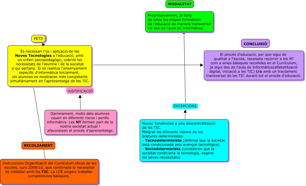 Este Cmap, tiene información relacionada con: amapsunit charo, ???? ???? Progressivament, al llarg de totes les etapes formatives de l'educació de manera transversal i/o des de l'aula de Informàtica., Darrerament, molts dels alumnes cauen en diferents riscos i perills informàtics. Les NT formen part de la nostra societat actual i afavoreixen el procés d'aprenentatge. JUSTIFICACIÓ FETS, Instruccions Organització del Currículum oficial de les escoles, curs 2009/10, que contempla la necessitat de treballar amb les TIC. La LOE exigeix treballar competències bàsiques. ???? ????, Noves Tendències a una descentralització de les TIC. Malgrat les diferents visions de les postures deterministes: - Tecnodeterminista (defensa que la societat està condicionada pels avenços tecnològics) - Sociodeterminista (consideren que la societat condiciona la tecnologia, segons les seves necessitats) EXCEPCIONS ????, És necessari l'ús i aplicació de les Noves Tecnologies a l'educació, amb un criteri psicopedagògic, cobrint les necessitats de l'alumne i de la societat a qui pertany. Si es realitza l'ensenyament específic d'informàtica inicialment, els alumnes es mostraran més competents simultàniament en l'aprenentatge de les TIC. ???? El procés d'educació, per que sigui de qualitat a l'escola, necessita recórrer a les NT com a eines bàsiques recollides en el Currículum, ja sigui des de l'aula de Informàtica(alfabetització digital, iniciació a les TIC) i/o amb un tractament transversal de les TIC durant tot el procés d'educació., ???? ???? Progressivament, al llarg de totes les etapes formatives de l'educació de manera transversal i/o des de l'aula de Informàtica.