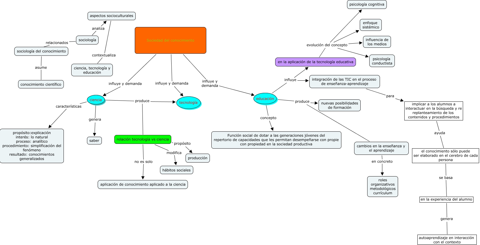 Este Cmap, tiene información relacionada con: Campos_Tenreiro_PEC 2_3, sociología relacionados ????, en la aplicación de la tecnología educativa evolución del concepto psicología cognitiva, sociología analiza aspectos socioculturales, en la experiencia del alumno genera autoaprendizaje en interacción con el contexto, el conocimiento sólo puede ser elaborado en el cerebro de cada persona se basa en la experiencia del alumno, relación tecnología vs ciencia modifica hábitos sociales, en la aplicación de la tecnología educativa evolución del concepto psicología conductista, ciencia características propósito:explicación interés: lo natural proceso: analítico procedimiento: simplificación del fenómeno resultado: conocimientos generalizados, educación concepto Función social de dotar a las generaciones jóvenes del repertorio de capacidades que les permitan desempeñarse con propie con propiedad en la sociedad productiva, Sociedad del conocimiento influye y demanda ciencia, Sociedad del conocimiento influye y demanda educación, implicar a los alumnos a interactuar en la búsqueda y re replanteamiento de los contenidos y procedimientos ayuda el conocimiento sólo puede ser elaborado en el cerebro de cada persona, cambios en la enseñanza y el aprendizaje en concreto roles organizativos metodológicos currículum, educación produce nuevas posibilidades de formación, en la aplicación de la tecnología educativa evolución del concepto enfoque sistémico, educación influye en la aplicación de la tecnología educativa, en la aplicación de la tecnología educativa evolución del concepto influencia de los medios, integración de las TIC en el proceso de enseñanza-aprendizaje para implicar a los alumnos a interactuar en la búsqueda y re replanteamiento de los contenidos y procedimientos, educación produce cambios en la enseñanza y el aprendizaje, Sociedad del conocimiento influye y demanda tecnología
