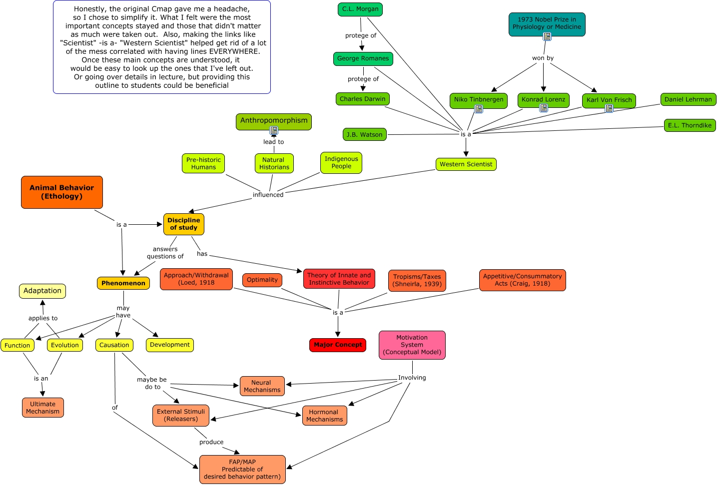 This Concept Map, created with IHMC CmapTools, has information related to: Edited Animal Behavior, Causation maybe be do to Hormonal Mechanisms, Appetitive/Consummatory Acts (Craig, 1918) is a Major Concept, Motivation System (Conceptual Model) Involving Neural Mechanisms, Karl Von Frisch is a Western Scientist, Phenomenon may have Evolution, Konrad Lorenz is a Western Scientist, C.L. Morgan protege of George Romanes, Indigenous People influenced Discipline of study, Niko Tinbnergen is a Western Scientist, Phenomenon may have Function, Daniel Lehrman is a Western Scientist, Animal Behavior (Ethology) is a Discipline of study, Discipline of study has Theory of Innate and Instinctive Behavior, Function applies to Adaptation, Causation maybe be do to External Stimuli (Releasers), Causation of FAP/MAP Predictable of desired behavior pattern), Discipline of study answers questions of Phenomenon, Natural Historians lead to Anthropomorphism, Optimality is a Major Concept, E.L. Thorndike is a Western Scientist