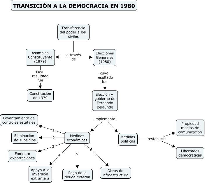 Este Cmap, tiene información relacionada con: BELAUNDE - TRANSICIÓN DEMOCRATICA 1980, Asamblea Constituyente (1979) cuyo resultado fue Constitución de 1979, Elección y gobierno de Fernando Belaúnde implementa Medidas políticas, Medidas económicas 1 Levantamiento de controles estatales, Transferencia del poder a los civiles a través de Elecciones Generales (1980), Medidas políticas restablece Libertades democráticas, Transferencia del poder a los civiles a través de Asamblea Constituyente (1979), Elecciones Generales (1980) cuyo resultado fue Elección y gobierno de Fernando Belaúnde, Medidas económicas 4 Apoyo a la inversión extranjera, Medidas económicas 5 Pago de la deuda externa, Medidas económicas 6 Obras de infraestructura, Medidas políticas restablece Propiedad medios de comunicación, Medidas económicas 2 Eliminación de subsidios, Elección y gobierno de Fernando Belaúnde implementa Medidas económicas, Medidas económicas 3 Fomento exportaciones