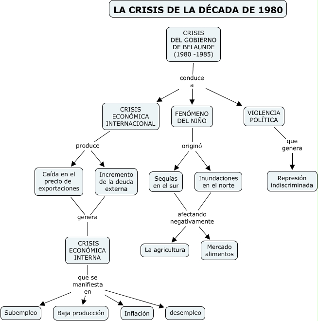 Este Cmap, tiene información relacionada con: BELAUNDE - CRISIS 1980 -1985, FENÓMENO DEL NIÑO originó Inundaciones en el norte, CRISIS ECONÓMICA INTERNA que se manifiesta en Inflación, CRISIS ECONÓMICA INTERNACIONAL produce Incremento de la deuda externa, CRISIS ECONÓMICA INTERNACIONAL produce Caída en el precio de exportaciones, Incremento de la deuda externa genera CRISIS ECONÓMICA INTERNA, Sequías en el sur afectando negativamente Mercado alimentos, CRISIS ECONÓMICA INTERNA que se manifiesta en Baja producción, Inundaciones en el norte afectando negativamente La agricultura, FENÓMENO DEL NIÑO originó Sequías en el sur, Caída en el precio de exportaciones genera CRISIS ECONÓMICA INTERNA, Inundaciones en el norte afectando negativamente Mercado alimentos, Sequías en el sur afectando negativamente La agricultura, CRISIS ECONÓMICA INTERNA que se manifiesta en desempleo, CRISIS ECONÓMICA INTERNA que se manifiesta en Subempleo, VIOLENCIA POLÍTICA que genera Represión indiscriminada