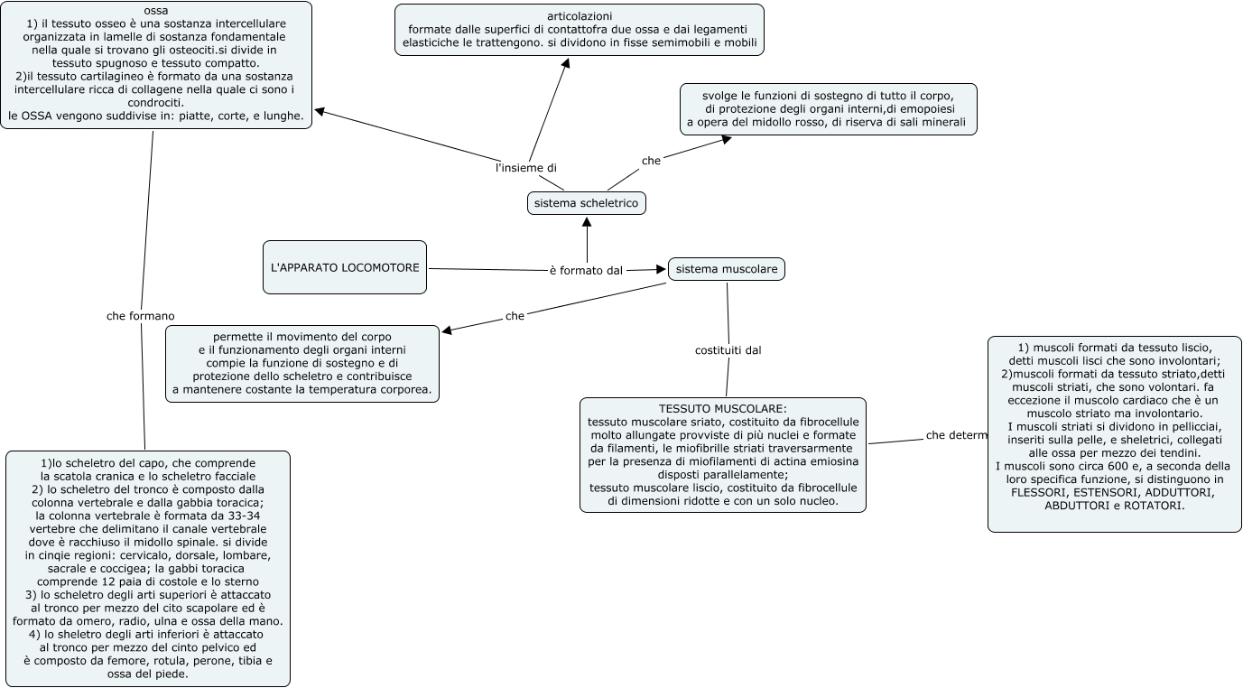 Questa Cmap, creata con IHMC CmapTools, contiene informazioni relative a: l'apparato locomotore Baccellieri, sistema scheletrico l'insieme di articolazioni formate dalle superfici di contattofra due ossa e dai legamenti elasticiche le trattengono. si dividono in fisse semimobili e mobili, sistema scheletrico l'insieme di ossa 1) il tessuto osseo è una sostanza intercellulare organizzata in lamelle di sostanza fondamentale nella quale si trovano gli osteociti.si divide in tessuto spugnoso e tessuto compatto. 2)il tessuto cartilagineo è formato da una sostanza intercellulare ricca di collagene nella quale ci sono i condrociti. le OSSA vengono suddivise in: piatte, corte, e lunghe., sistema muscolare che permette il movimento del corpo e il funzionamento degli organi interni compie la funzione di sostegno e di protezione dello scheletro e contribuisce a mantenere costante la temperatura corporea., TESSUTO MUSCOLARE: tessuto muscolare sriato, costituito da fibrocellule molto allungate provviste di più nuclei e formate da filamenti, le miofibrille striati traversarmente per la presenza di miofilamenti di actina emiosina disposti parallelamente; tessuto muscolare liscio, costituito da fibrocellule di dimensioni ridotte e con un solo nucleo. che determina 1) muscoli formati da tessuto liscio, detti muscoli lisci che sono involontari; 2)muscoli formati da tessuto striato,detti muscoli striati, che sono volontari. fa eccezione il muscolo cardiaco che è un muscolo striato ma involontario. I muscoli striati si dividono in pellicciai, inseriti sulla pelle, e sheletrici, collegati alle ossa per mezzo dei tendini. I muscoli sono circa 600 e, a seconda della loro specifica funzione, si distinguono in FLESSORI, ESTENSORI, ADDUTTORI, ABDUTTORI e ROTATORI., sistema scheletrico che svolge le funzioni di sostegno di tutto il corpo, di protezione degli organi interni,di emopoiesi a opera del midollo rosso, di riserva di sali minerali, L'APPARATO LOCOMOTORE è formato dal sistema scheletrico, sistema muscolare costituiti dal TESSUTO MUSCOLARE: tessuto muscolare sriato, costituito da fibrocellule molto allungate provviste di più nuclei e formate da filamenti, le miofibrille striati traversarmente per la presenza di miofilamenti di actina emiosina disposti parallelamente; tessuto muscolare liscio, costituito da fibrocellule di dimensioni ridotte e con un solo nucleo., L'APPARATO LOCOMOTORE è formato dal sistema muscolare, ossa 1) il tessuto osseo è una sostanza intercellulare organizzata in lamelle di sostanza fondamentale nella quale si trovano gli osteociti.si divide in tessuto spugnoso e tessuto compatto. 2)il tessuto cartilagineo è formato da una sostanza intercellulare ricca di collagene nella quale ci sono i condrociti. le OSSA vengono suddivise in: piatte, corte, e lunghe. che formano 1)lo scheletro del capo, che comprende la scatola cranica e lo scheletro facciale 2) lo scheletro del tronco è composto dalla colonna vertebrale e dalla gabbia toracica; la colonna vertebrale è formata da 33-34 vertebre che delimitano il canale vertebrale dove è racchiuso il midollo spinale. si divide in cinqie regioni: cervicalo, dorsale, lombare, sacrale e coccigea; la gabbi toracica comprende 12 paia di costole e lo sterno 3) lo scheletro degli arti superiori è attaccato al tronco per mezzo del cito scapolare ed è formato da omero, radio, ulna e ossa della mano. 4) lo sheletro degli arti inferiori è attaccato al tronco per mezzo del cinto pelvico ed è composto da femore, rotula, perone, tibia e ossa del piede.