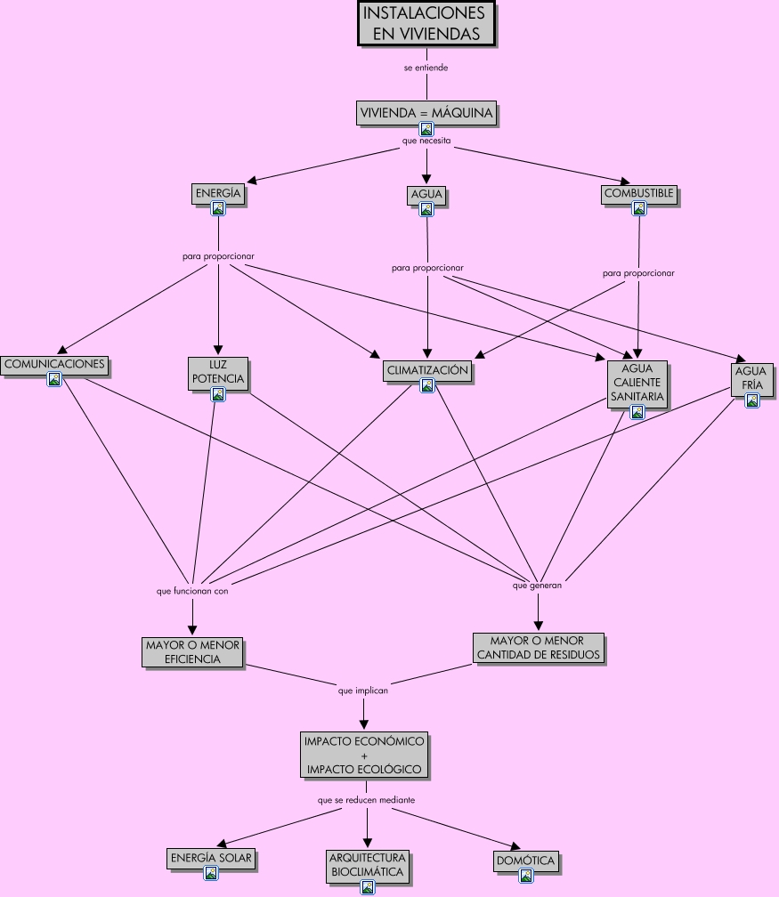 Este Cmap, tiene información relacionada con: Instalaciones en viviendas, ENERGÍA para proporcionar LUZ POTENCIA, VIVIENDA = MÁQUINA que necesita AGUA, IMPACTO ECONÓMICO + IMPACTO ECOLÓGICO que se reducen mediante DOMÓTICA, COMUNICACIONES que funcionan con MAYOR O MENOR EFICIENCIA, COMUNICACIONES que generan MAYOR O MENOR CANTIDAD DE RESIDUOS, IMPACTO ECONÓMICO + IMPACTO ECOLÓGICO que se reducen mediante ARQUITECTURA BIOCLIMÁTICA, CLIMATIZACIÓN que generan MAYOR O MENOR CANTIDAD DE RESIDUOS, CLIMATIZACIÓN que funcionan con MAYOR O MENOR EFICIENCIA, AGUA para proporcionar AGUA CALIENTE SANITARIA, ENERGÍA para proporcionar CLIMATIZACIÓN, LUZ POTENCIA que funcionan con MAYOR O MENOR EFICIENCIA, AGUA CALIENTE SANITARIA que generan MAYOR O MENOR CANTIDAD DE RESIDUOS, AGUA FRÍA que funcionan con MAYOR O MENOR EFICIENCIA, VIVIENDA = MÁQUINA que necesita ENERGÍA, IMPACTO ECONÓMICO + IMPACTO ECOLÓGICO que se reducen mediante ENERGÍA SOLAR, COMBUSTIBLE para proporcionar AGUA CALIENTE SANITARIA, AGUA FRÍA que generan MAYOR O MENOR CANTIDAD DE RESIDUOS, AGUA para proporcionar CLIMATIZACIÓN, ENERGÍA para proporcionar COMUNICACIONES, LUZ POTENCIA que generan MAYOR O MENOR CANTIDAD DE RESIDUOS