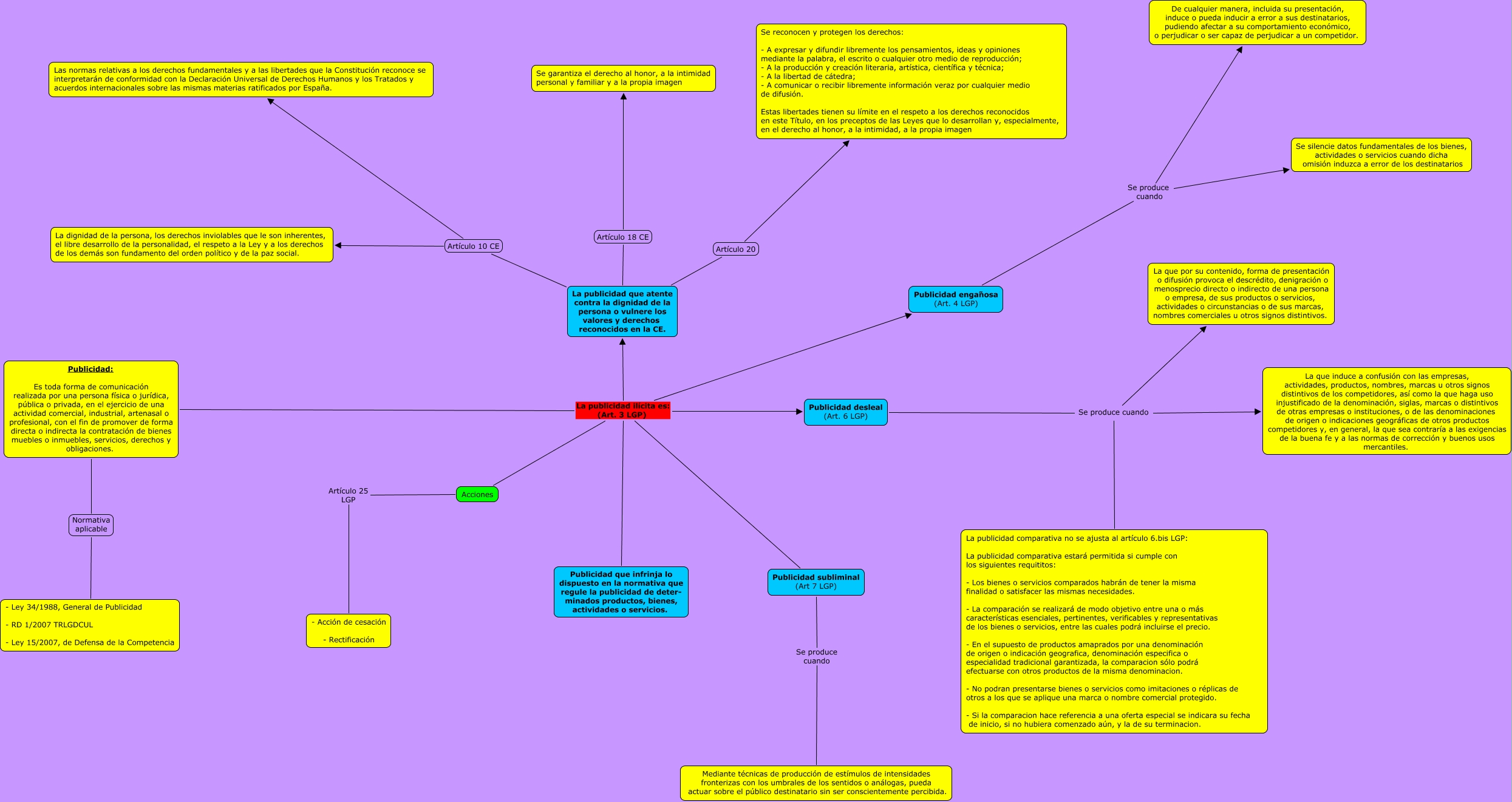 Este Cmap, tiene información relacionada con: EQUIPO A Publicidad (Noe y Cris), Publicidad engañosa (Art. 4 LGP) Se produce cuando De cualquier manera, incluida su presentación, induce o pueda inducir a error a sus destinatarios, pudiendo afectar a su comportamiento económico, o perjudicar o ser capaz de perjudicar a un competidor., Publicidad: Es toda forma de comunicación realizada por una persona física o jurídica, pública o privada, en el ejercicio de una actividad comercial, industrial, artenasal o profesional, con el fin de promover de forma directa o indirecta la contratación de bienes muebles o inmuebles, servicios, derechos y obligaciones. Normativa aplicable - Ley 34/1988, General de Publicidad - RD 1/2007 TRLGDCUL - Ley 15/2007, de Defensa de la Competencia, La publicidad que atente contra la dignidad de la persona o vulnere los valores y derechos reconocidos en la CE. Artículo 18 CE Se garantiza el derecho al honor, a la intimidad personal y familiar y a la propia imagen, La publicidad que atente contra la dignidad de la persona o vulnere los valores y derechos reconocidos en la CE. Artículo 10 CE Las normas relativas a los derechos fundamentales y a las libertades que la Constitución reconoce se interpretarán de conformidad con la Declaración Universal de Derechos Humanos y los Tratados y acuerdos internacionales sobre las mismas materias ratificados por España., La publicidad que atente contra la dignidad de la persona o vulnere los valores y derechos reconocidos en la CE. Artículo 20 Se reconocen y protegen los derechos: - A expresar y difundir libremente los pensamientos, ideas y opiniones mediante la palabra, el escrito o cualquier otro medio de reproducción; - A la producción y creación literaria, artística, científica y técnica; - A la libertad de cátedra; - A comunicar o recibir libremente información veraz por cualquier medio de difusión. Estas libertades tienen su límite en el respeto a los derechos reconocidos en este Título, en los preceptos de las Leyes que lo desarrollan y, especialmente, en el derecho al honor, a la intimidad, a la propia imagen, Publicidad: Es toda forma de comunicación realizada por una persona física o jurídica, pública o privada, en el ejercicio de una actividad comercial, industrial, artenasal o profesional, con el fin de promover de forma directa o indirecta la contratación de bienes muebles o inmuebles, servicios, derechos y obligaciones. La publicidad ilícita es: (Art. 3 LGP) Publicidad engañosa (Art. 4 LGP), Publicidad: Es toda forma de comunicación realizada por una persona física o jurídica, pública o privada, en el ejercicio de una actividad comercial, industrial, artenasal o profesional, con el fin de promover de forma directa o indirecta la contratación de bienes muebles o inmuebles, servicios, derechos y obligaciones. La publicidad ilícita es: (Art. 3 LGP) Publicidad desleal (Art. 6 LGP), Publicidad engañosa (Art. 4 LGP) Se produce cuando Se silencie datos fundamentales de los bienes, actividades o servicios cuando dicha omisión induzca a error de los destinatarios, Publicidad desleal (Art. 6 LGP) Se produce cuando La publicidad comparativa no se ajusta al artículo 6.bis LGP: La publicidad comparativa estará permitida si cumple con los siguientes requititos: - Los bienes o servicios comparados habrán de tener la misma finalidad o satisfacer las mismas necesidades. - La comparación se realizará de modo objetivo entre una o más características esenciales, pertinentes, verificables y representativas de los bienes o servicios, entre las cuales podrá incluirse el precio. - En el supuesto de productos amaprados por una denominación de origen o indicación geografica, denominación especifica o especialidad tradicional garantizada, la comparacion sólo podrá efectuarse con otros productos de la misma denominacion. - No podran presentarse bienes o servicios como imitaciones o réplicas de otros a los que se aplique una marca o nombre comercial protegido. - Si la comparacion hace referencia a una oferta especial se indicara su fecha de inicio, si no hubiera comenzado aún, y la de su terminacion., Acciones Artículo 25 LGP - Acción de cesación - Rectificación, Publicidad: Es toda forma de comunicación realizada por una persona física o jurídica, pública o privada, en el ejercicio de una actividad comercial, industrial, artenasal o profesional, con el fin de promover de forma directa o indirecta la contratación de bienes muebles o inmuebles, servicios, derechos y obligaciones. La publicidad ilícita es: (Art. 3 LGP) Publicidad subliminal (Art 7 LGP), Publicidad desleal (Art. 6 LGP) Se produce cuando La que induce a confusión con las empresas, actividades, productos, nombres, marcas u otros signos distintivos de los competidores, así como la que haga uso injustificado de la denominación, siglas, marcas o distintivos de otras empresas o instituciones, o de las denominaciones de origen o indicaciones geográficas de otros productos competidores y, en general, la que sea contraría a las exigencias de la buena fe y a las normas de corrección y buenos usos mercantiles., La publicidad que atente contra la dignidad de la persona o vulnere los valores y derechos reconocidos en la CE. Artículo 10 CE La dignidad de la persona, los derechos inviolables que le son inherentes, el libre desarrollo de la personalidad, el respeto a la Ley y a los derechos de los demás son fundamento del orden político y de la paz social., Publicidad: Es toda forma de comunicación realizada por una persona física o jurídica, pública o privada, en el ejercicio de una actividad comercial, industrial, artenasal o profesional, con el fin de promover de forma directa o indirecta la contratación de bienes muebles o inmuebles, servicios, derechos y obligaciones. La publicidad ilícita es: (Art. 3 LGP) Publicidad que infrinja lo dispuesto en la normativa que regule la publicidad de deter- minados productos, bi